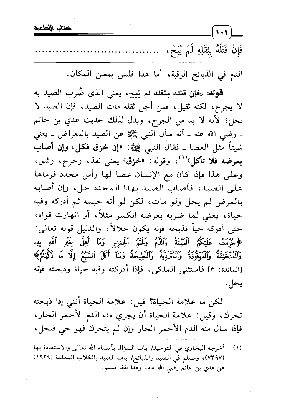 قوله: «فإن قتله بثقله لم يُبح» يعني الذي ضُرب الصيد به لا يجرح، لكنه ثقيل، فمن أجل ثقله مات الصيد، فإن الصيد لا يحل؛ لأنه لا بد من الجرح، ويدل لذلك حديث عدي بن حاتم ـ رضي الله عنه ـ أنه سأل النبي صلّى الله عليه وسلّم عن الصيد بالمعراض ـ يعني شيئاً مثل العصا ـ فقال النبي صلّى الله عليه وسلّم: «إن خزق فكل، وإن أصاب بعرضه فلا تأكل» (¬1)، وقوله: «خزق» يعني نفذ، وجرح، وشق، وعلى هذا فإذا كان مع الإنسان عصا لها رأس محدد فرماها على الصيد، فأصاب الصيد بهذا المحدد حل، وإن أصابه بالعرض لم يحل ولو مات، لكن لو أنه حبسه ثم أدركه وفيه حياة، يعني لما ضربه بعرضه انكسر مثلاً، أو انهارت قواه، حتى أدركه حياً فذبحه فإنه يكون حلالاً، والدليل قوله تعالى: {حُرِّمَتْ عَلَيْكُمُ الْمَيْتَةُ وَالدَّمُ وَلَحْمُ الْخِنْزِيرِ وَمَا أُهِلَّ لِغَيْرِ اللَّهِ بِهِ وَالْمُنْخَنِقَةُ وَالْمَوْقُوذَةُ وَالْمُتَرَدِّيَةُ وَالنَّطِيحَةُ وَمَا أَكَلَ السَّبُعُ إِلاَّ مَا ذَكَّيْتُمْ} [المائدة: 3] فاستثنى المذكى، فإذا أدركته وفيه حياة وذبحته فإنه يحل.