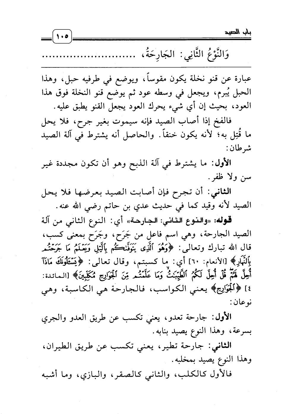 قوله: «والنوع الثاني: الجارحة» أي: النوع الثاني من آلة الصيد الجارحة، وهي اسم فاعل من جَرَح، وجَرَح بمعنى كسب، قال الله تبارك وتعالى: {وَهُوَ الَّذِي يَتَوفَّاكُمْ بِاللَّيْلِ وَيَعْلَمُ مَا جَرَحْتُمْ بِالنَّهَارِ} [الأنعام: 60] أي: ما كسبتم، وقال تعالى: {يَسْأَلُونَكَ مَاذَا أُحِلَّ لَهُمْ قُلْ أُحِلَّ لَكُمُ الطَّيِّبَاتُ وَمَا عَلَّمْتُمْ مِنَ الْجَوَارِحِ مُكَلِّبِينَ} [المائدة: 4] {الْجَوَارِحِ} يعني الكواسب، فالجارحة هي الكاسبة، وهي نوعان:
