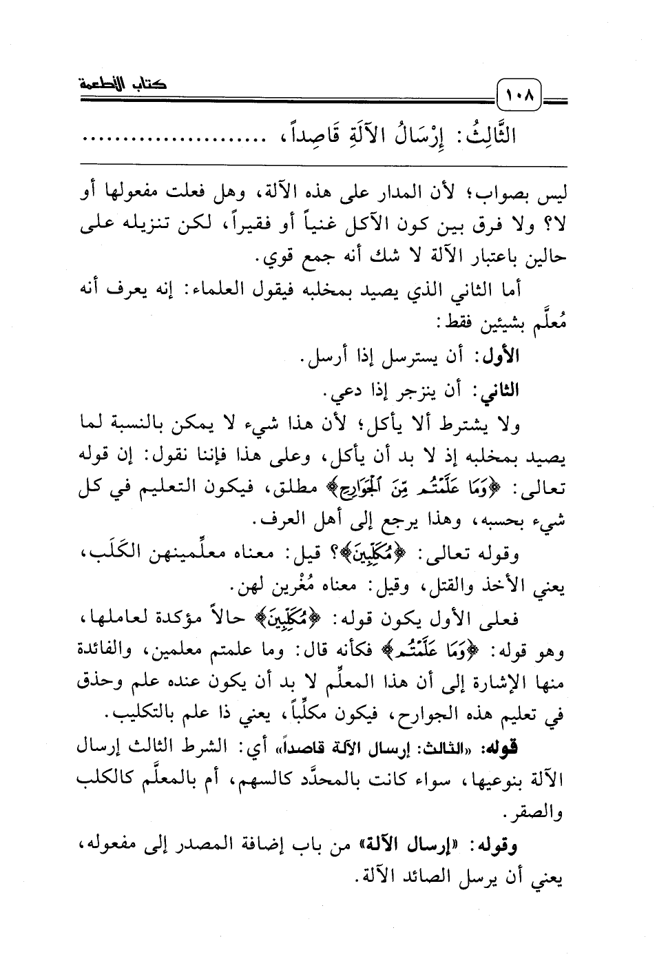 قوله: «الثالث: إرسال الآلة قاصداً» أي: الشرط الثالث إرسال الآلة بنوعيها، سواء كانت بالمحدَّد كالسهم، أم بالمعلَّم كالكلب والصقر.