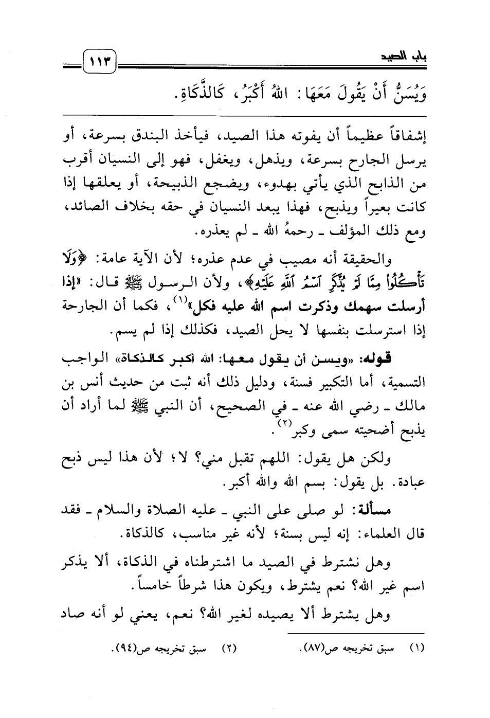 إشفاقاً عظيماً أن يفوته هذا الصيد، فيأخذ البندق بسرعة، أو يرسل الجارح بسرعة، ويذهل، ويغفل، فهو إلى النسيان أقرب من الذابح الذي يأتي بهدوء، ويضجع الذبيحة، أو يعلقها إذا كانت بعيراً ويذبح، فهذا يبعد النسيان في حقه بخلاف الصائد، ومع ذلك المؤلف ـ رحمه الله ـ لم يعذره.