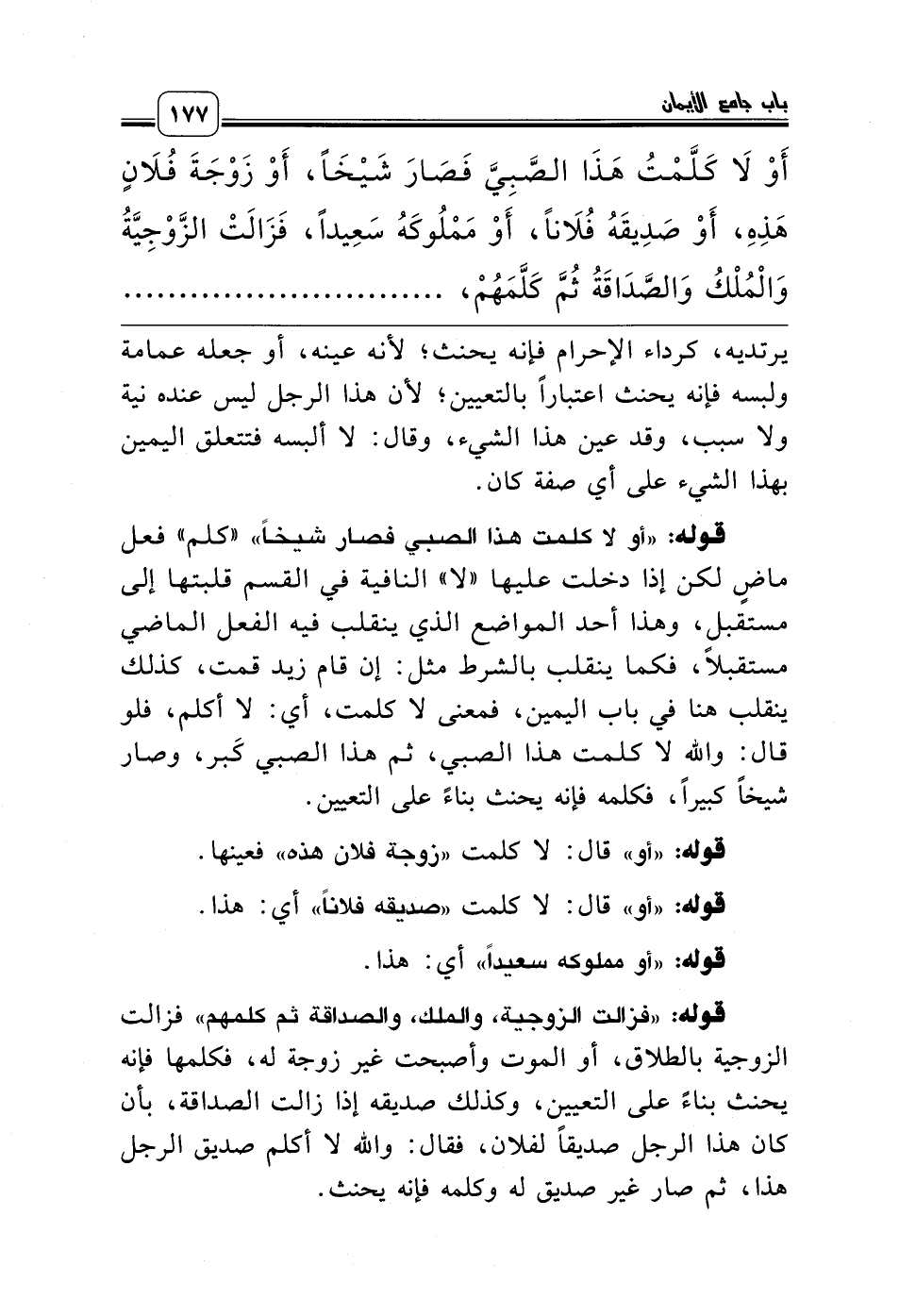 قوله: «أو لا كلمت هذا الصبي فصار شيخاً» «كلم» فعل ماضٍ لكن إذا دخلت عليها «لا» النافية في القسم قلبتها إلى مستقبل، وهذا أحد المواضع الذي ينقلب فيه الفعل الماضي مستقبلاً، فكما ينقلب بالشرط مثل: إن قام زيد قمت، كذلك ينقلب هنا في باب اليمين، فمعنى لا كلمت، أي: لا أكلم، فلو قال: والله لا كلمت هذا الصبي، ثم هذا الصبي كَبر، وصار شيخاً كبيراً، فكلمه فإنه يحنث بناءً على التعيين.