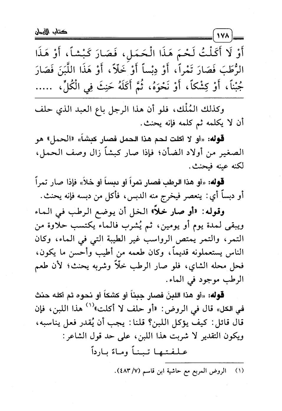 قوله: «أو هذا اللبنَ فصار جبناً أو كشكاً أو نحوه ثم أكله حنث في الكل» قال في الروض: «أو حلف لا أكلت» (¬1) هذا اللبن، فإن قال قائل: كيف يؤكل اللبن؟ قلنا: يجب أن يُقدر فعل يناسبه، ويكون التقدير لا شربت هذا اللبن، على حد قول الشاعر: