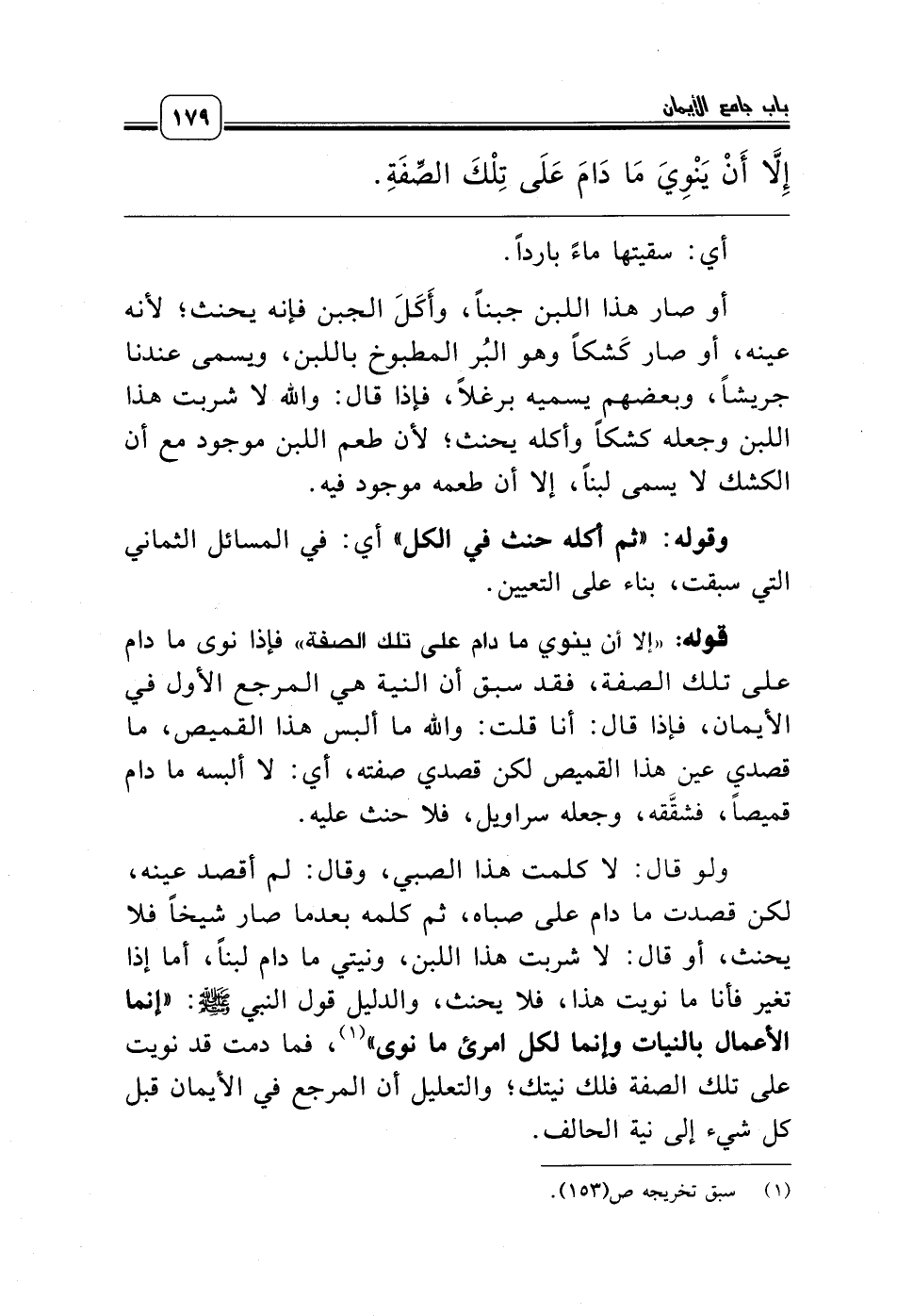 ولو قال: لا كلمت هذا الصبي، وقال: لم أقصد عينه، لكن قصدت ما دام على صباه، ثم كلمه بعدما صار شيخاً فلا يحنث، أو قال: لا شربت هذا اللبن، ونيتي ما دام لبناً، أما إذا تغير فأنا ما نويت هذا، فلا يحنث، والدليل قول النبي صلّى الله عليه وسلّم: «إنما الأعمال بالنيات وإنما لكل امرئ ما نوى» (¬1)، فما دمت قد نويت على تلك الصفة فلك نيتك؛ والتعليل أن المرجع في الأيمان قبل كل شيء إلى نية الحالف.