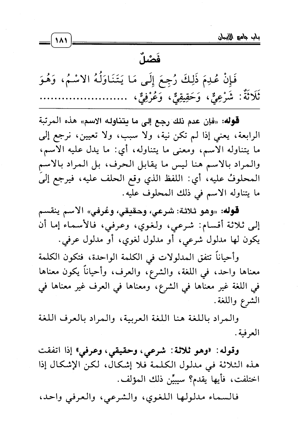 قوله: «وهو ثلاثة: شرعي، وحقيقي، وعُرفي» الاسم ينقسم إلى ثلاثة أقسام: شرعي، ولغوي، وعرفي، فالأسماء إما أن يكون لها مدلول شرعي، أو مدلول لغوي، أو مدلول عرفي.