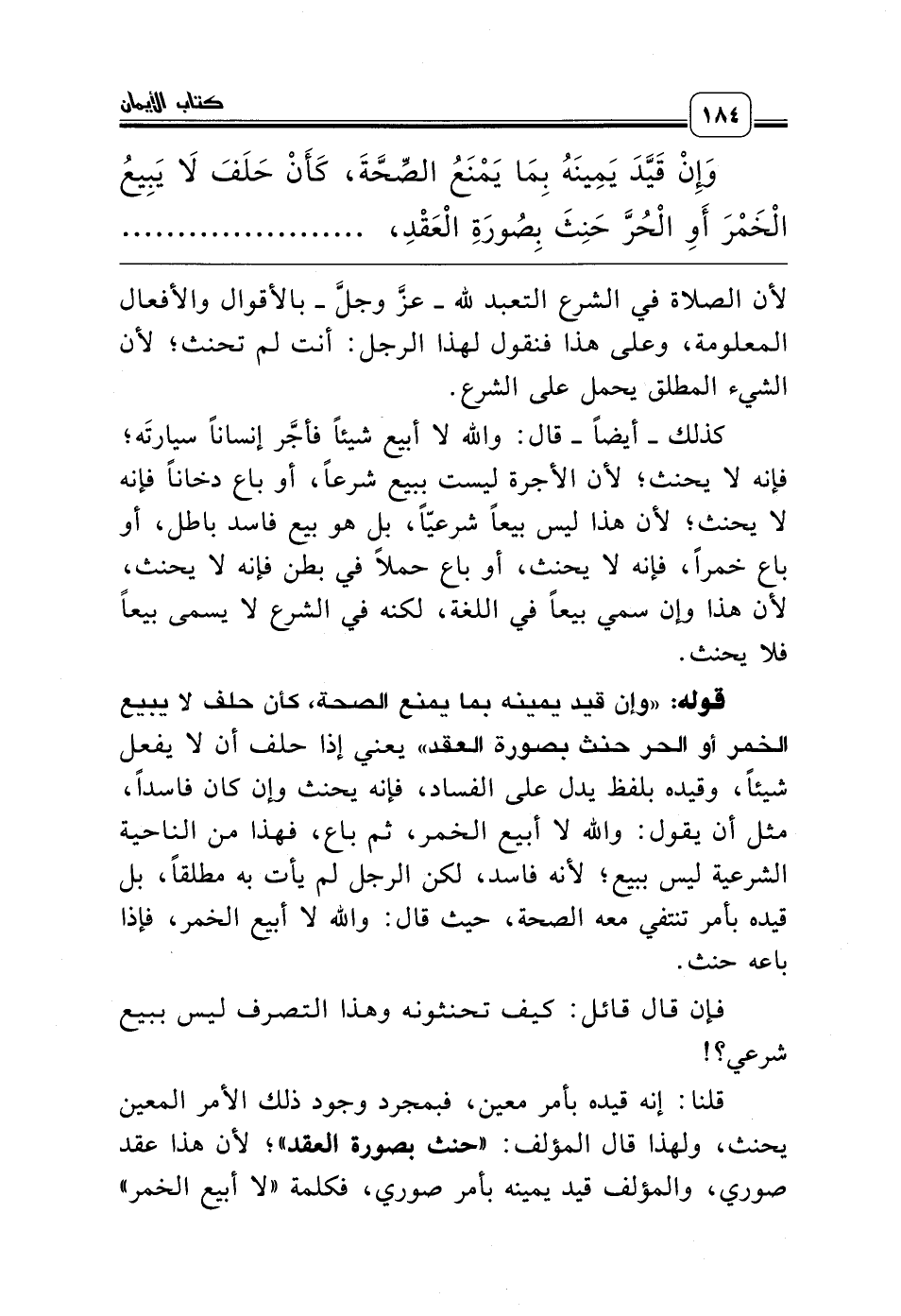 قلنا: إنه قيده بأمر معين، فبمجرد وجود ذلك الأمر المعين يحنث، ولهذا قال المؤلف: «حنث بصورة العقد»؛ لأن هذا عقد صوري، والمؤلف قيد يمينه بأمر صوري، فكلمة «لا أبيع الخمر»