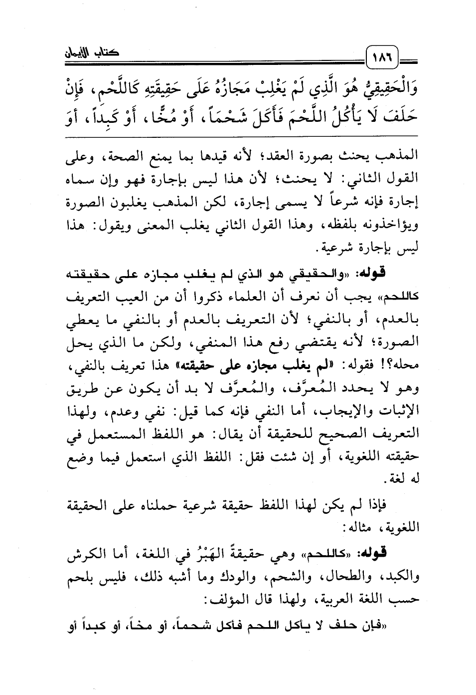 قوله: «والحقيقي هو الذي لم يغلب مجازه على حقيقته كاللحم» يجب أن نعرف أن العلماء ذكروا أن من العيب التعريف بالعدم، أو بالنفي؛ لأن التعريف بالعدم أو بالنفي ما يعطي الصورة؛ لأنه يقتضي رفع هذا المنفي، ولكن ما الذي يحل محله؟! فقوله: «لم يغلب مجازه على حقيقته» هذا تعريف بالنفي، وهو لا يحدد المُعرَّف، والمُعرَّف لا بد أن يكون عن طريق الإثبات والإيجاب، أما النفي فإنه كما قيل: نفي وعدم، ولهذا التعريف الصحيح للحقيقة أن يقال: هو اللفظ المستعمل في حقيقته اللغوية، أو إن شئت فقل: اللفظ الذي استعمل فيما وضع له لغة.