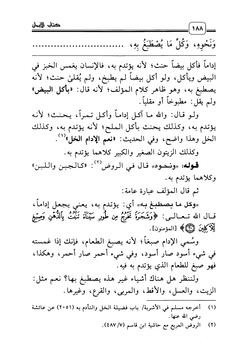 «وكل ما يصطبغ به» أي: يؤتدم به، يعني يجعل إداماً، قال الله تعالى: {وَشَجَرَةً تَخْرُجُ مِنْ طُورِ سَيْنَاءَ تَنْبُتُ بِالدُّهْنِ وَصِبْغٍ لِلآكِلِينَ} [المؤمنون:20].