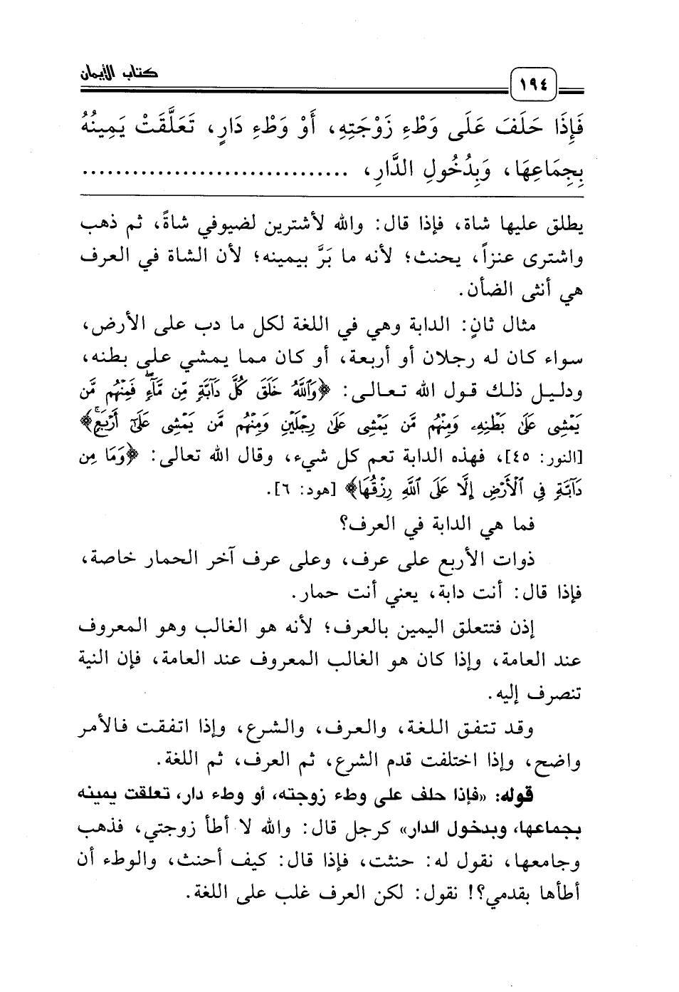 مثال ثانٍ: الدابة وهي في اللغة لكل ما دب على الأرض، سواء كان له رجلان أو أربعة، أو كان مما يمشي على بطنه، ودليل ذلك قول الله تعالى: {وَاللَّهُ خَلَقَ كُلَّ دَآبَّةٍ مِنْ مَاءٍ فَمِنْهُمْ مَنْ يَمْشِي عَلَى بَطْنِهِ وَمِنْهُمْ مَنْ يَمْشِي عَلَى رِجْلَيْنِ وَمِنْهُمْ مَنْ يَمْشِي عَلَى أَرْبَعٍ} [النور: 45]، فهذه الدابة تعم كل شيء، وقال الله تعالى: {وَمَا مِنْ دَآبَّةٍ فِي الأَرْضِ إِلاَّ عَلَى اللَّهِ رِزْقُهَا} [هود: 6].