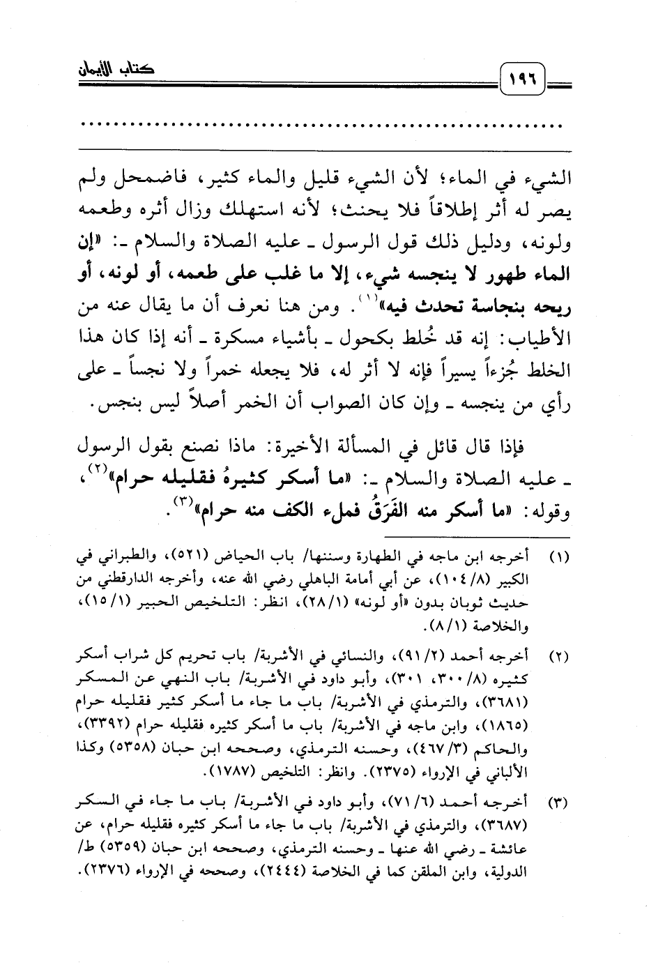 (¬3) أخرجه أحمد (6/ 71)، وأبو داود في الأشربة/ باب ما جاء في السكر (3687)، والترمذي في الأشربة/ باب ما جاء ما أسكر كثيره فقليله حرام، عن عائشة ـ رضي الله عنها ـ وحسنه الترمذي، وصححه ابن حبان (5359) ط/الدولية، وابن الملقن كما في الخلاصة (2444)، وصححه في الإرواء (2376).