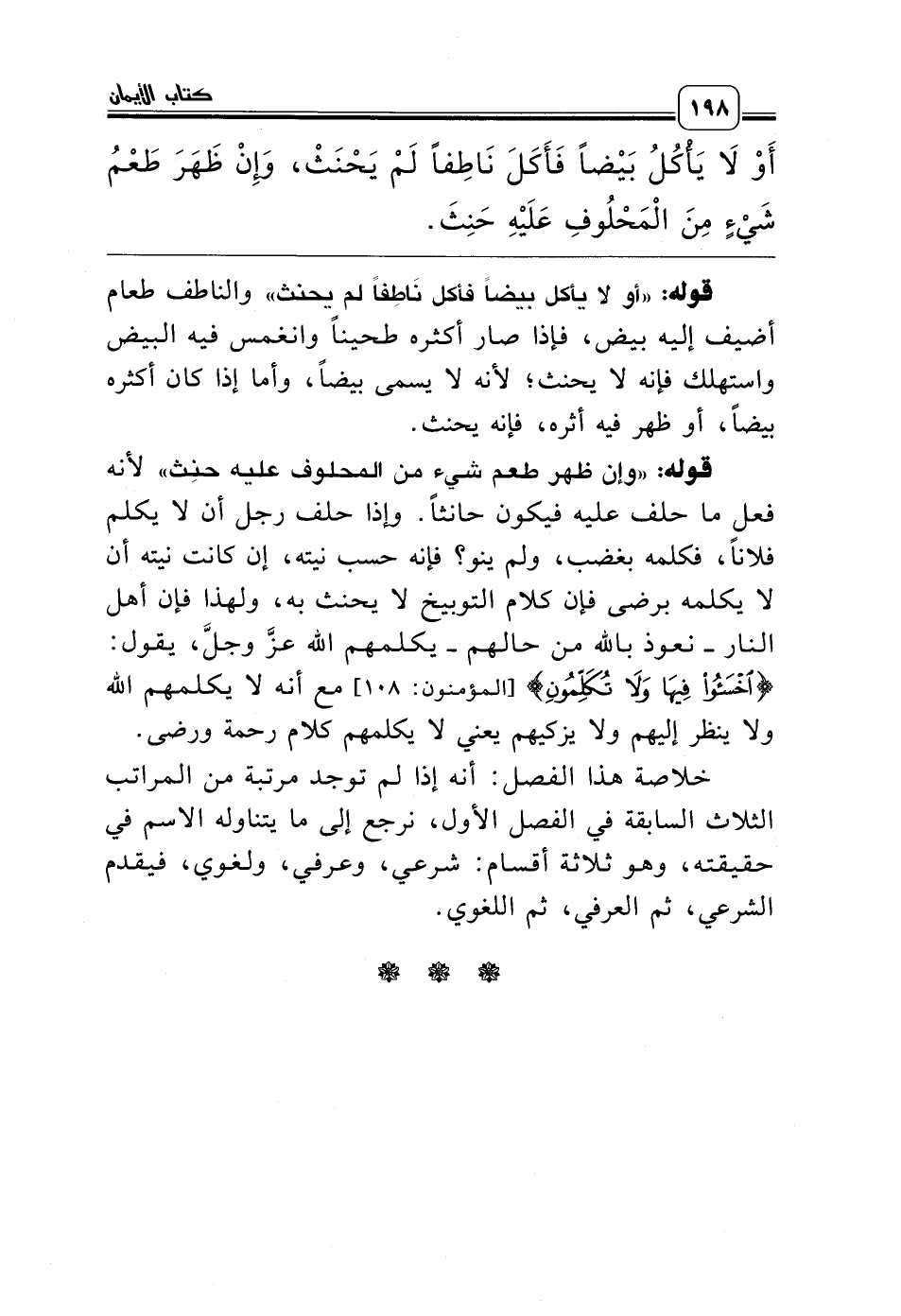 قوله: «وإن ظهر طعم شيء من المحلوف عليه حنِث» لأنه فعل ما حلف عليه فيكون حانثاً. وإذا حلف رجل أن لا يكلم فلاناً، فكلمه بغضب، ولم ينو؟ فإنه حسب نيته، إن كانت نيته أن لا يكلمه برضى فإن كلام التوبيخ لا يحنث به، ولهذا فإن أهل النار ـ نعوذ بالله من حالهم ـ يكلمهم الله عزّ وجل، يقول: {اخْسَأُوا فِيهَا وَلاَ تُكَلِّمُونِ} [المؤمنون: 108] مع أنه لا يكلمهم الله ولا ينظر إليهم ولا يزكيهم يعني لا يكلمهم كلام رحمة ورضى.