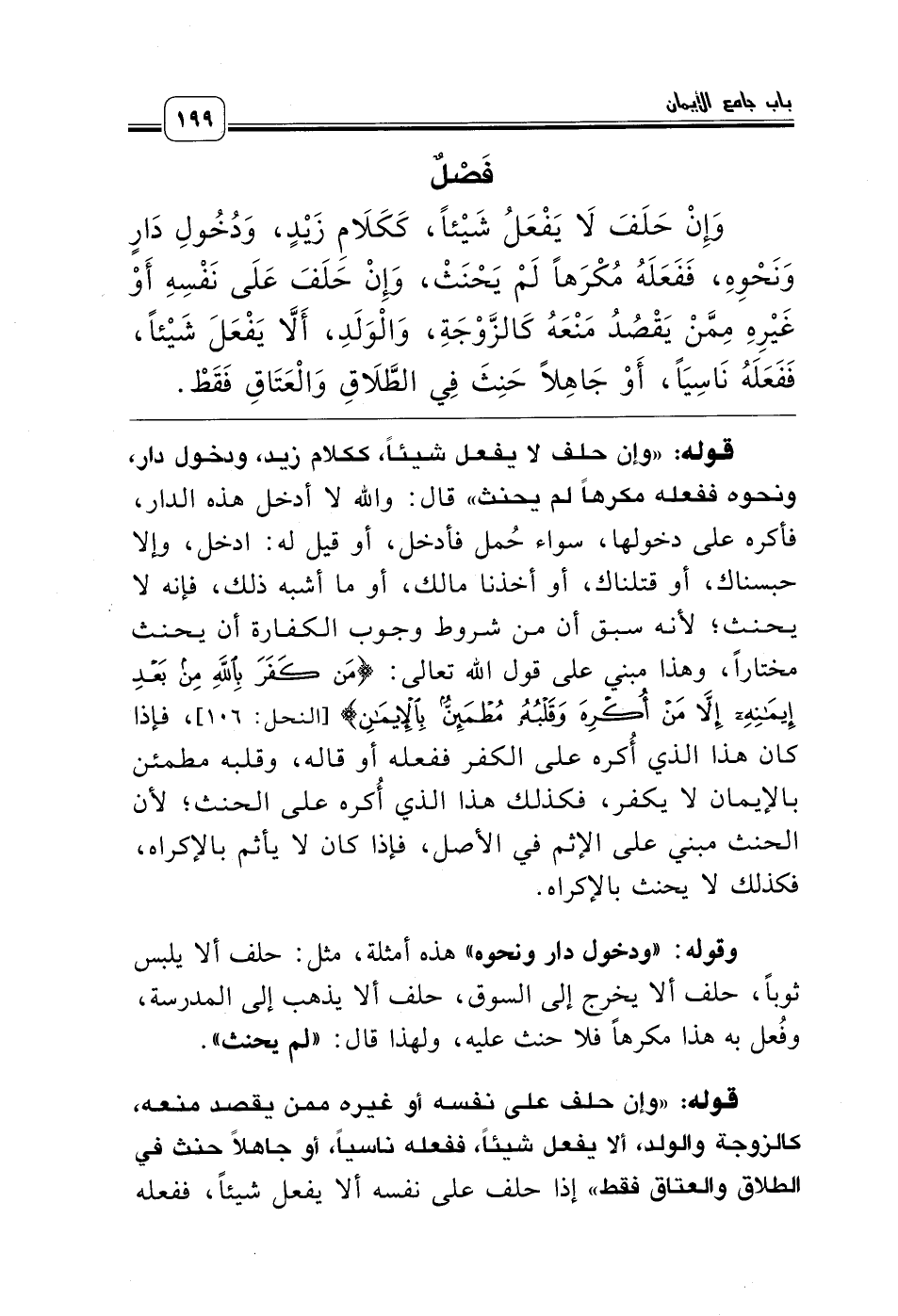 قوله: «وإن حلف لا يفعل شيئاً، ككلام زيد، ودخول دار، ونحوه ففعله مكرهاً لم يحنث» قال: والله لا أدخل هذه الدار، فأكره على دخولها، سواء حُمل فأدخل، أو قيل له: ادخل، وإلا حبسناك، أو قتلناك، أو أخذنا مالك، أو ما أشبه ذلك، فإنه لا يحنث؛ لأنه سبق أن من شروط وجوب الكفارة أن يحنث مختاراً، وهذا مبني على قول الله تعالى: {مَنْ كَفَرَ بِاللَّهِ مِنْ بَعْدِ إِيمَانِهِ إِلاَّ مَنْ أُكْرِهَ وَقَلْبُهُ مُطْمَئِنٌّ بِالإِيمَانِ} [النحل: 106]، فإذا كان هذا الذي أُكره على الكفر ففعله أو قاله، وقلبه مطمئن بالإيمان لا يكفر، فكذلك هذا الذي أُكره على الحنث؛ لأن الحنث مبني على الإثم في الأصل، فإذا كان لا يأثم بالإكراه، فكذلك لا يحنث بالإكراه.