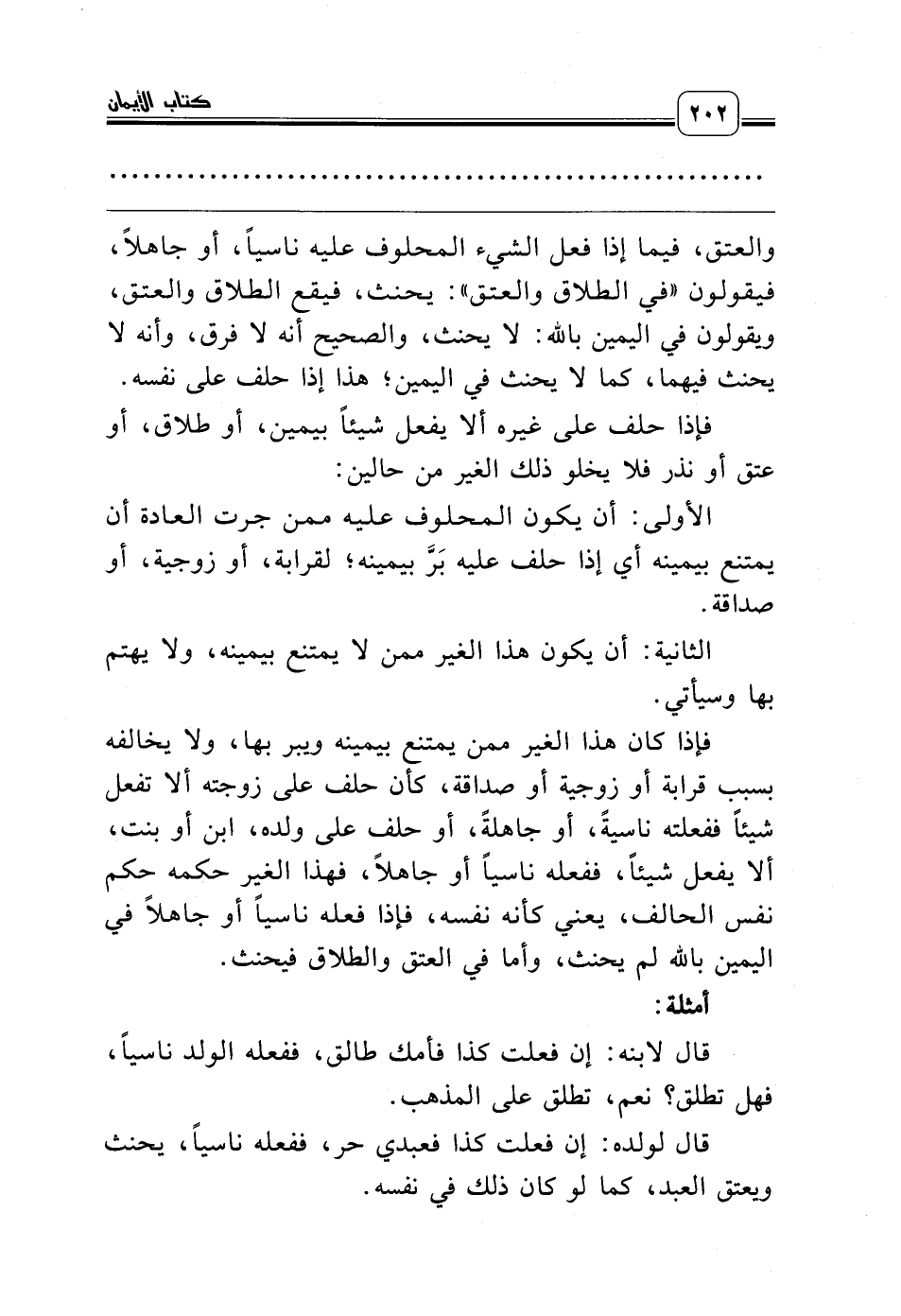 والعتق، فيما إذا فعل الشيء المحلوف عليه ناسياً، أو جاهلاً، فيقولون «في الطلاق والعتق»: يحنث، فيقع الطلاق والعتق، ويقولون في اليمين بالله: لا يحنث، والصحيح أنه لا فرق، وأنه لا يحنث فيهما، كما لا يحنث في اليمين؛ هذا إذا حلف على نفسه.