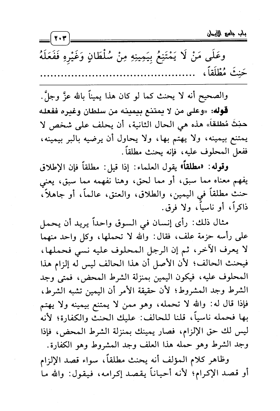 مثال ذلك: رأى إنسان في السوق واحداً يريد أن يحمل على رأسه حزمة علف، فقال: والله لا تحملها، وكل واحد منهما لا يعرف الآخر، ثم إن الرجل المحلوف عليه نسي فحملها، فيحنث الحالف؛ لأن الأصل أن هذا الحالف ليس له إلزام هذا المحلوف عليه، فيكون اليمين بمنزلة الشرط المحض، فمتى وجد الشرط وجد المشروط؛ لأن حقيقة الأمر أن اليمين تشبه الشرط، فإذا قال له: والله لا تحمله، وهو ممن لا يمتنع بيمينه ولا يهتم بها فحمله ناسياً، قلنا للحالف: عليك الحنث والكفارة؛ لأنه ليس لك حق الإلزام، فصار يمينك بمنزلة الشرط المحض، فإذا وجد الشرط وهو حمله هذا العلف وجد المشروط وهو الكفارة.