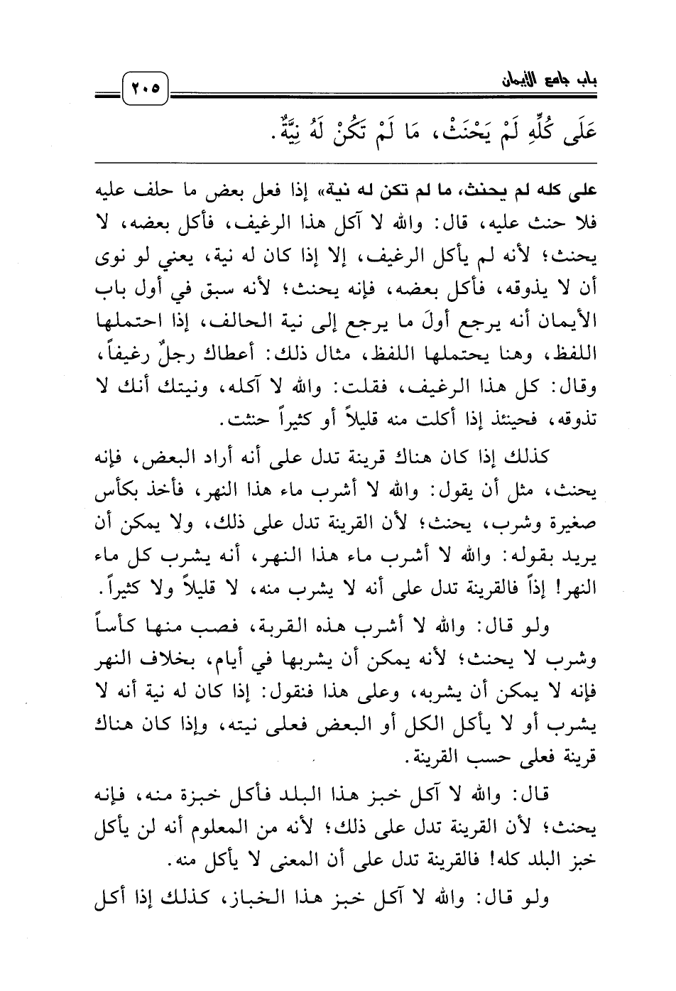 على كله لم يحنث، ما لم تكن له نية» إذا فعل بعض ما حلف عليه فلا حنث عليه، قال: والله لا آكل هذا الرغيف، فأكل بعضه، لا يحنث؛ لأنه لم يأكل الرغيف، إلا إذا كان له نية، يعني لو نوى أن لا يذوقه، فأكل بعضه، فإنه يحنث؛ لأنه سبق في أول باب الأيمان أنه يرجع أولَ ما يرجع إلى نية الحالف، إذا احتملها اللفظ، وهنا يحتملها اللفظ، مثال ذلك: أعطاك رجلٌ رغيفاً، وقال: كل هذا الرغيف، فقلت: والله لا آكله، ونيتك أنك لا تذوقه، فحينئذ إذا أكلت منه قليلاً أو كثيراً حنثت.