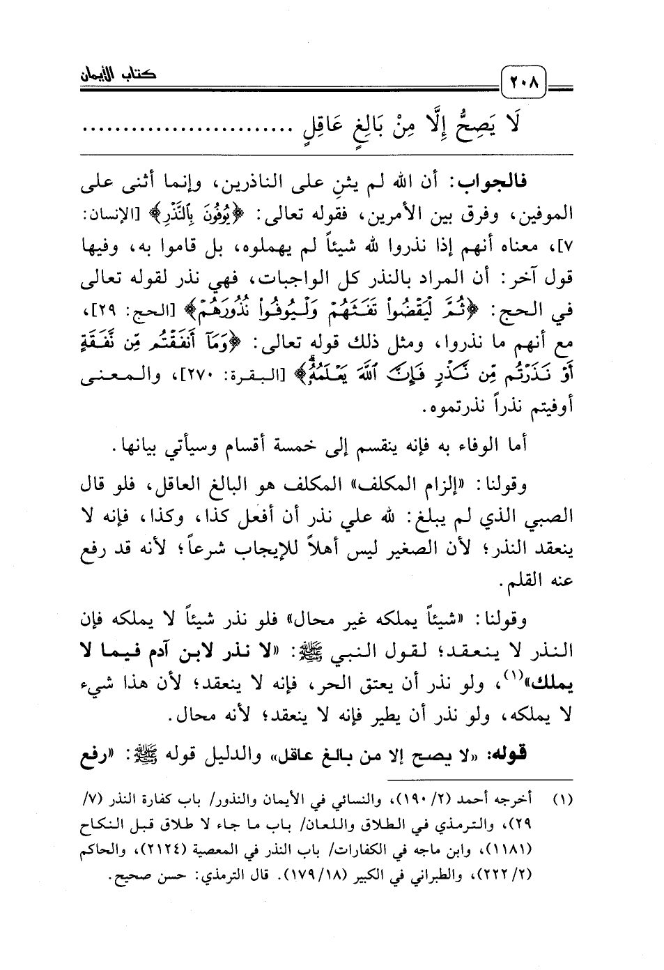 (¬1) أخرجه أحمد (2/ 190)، والنسائي في الأيمان والنذور/ باب كفارة النذر (7/ 29)، والترمذي في الطلاق واللعان/ باب ما جاء لا طلاق قبل النكاح (1181)، وابن ماجه في الكفارات/ باب النذر في المعصية (2124)، والحاكم (2/ 222)، والطبراني في الكبير (18/ 179). قال الترمذي: حسن صحيح.