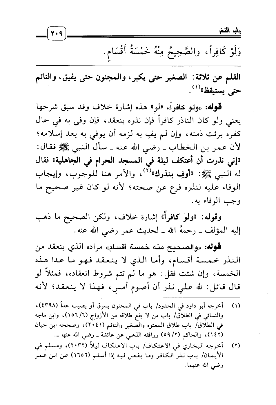 قوله: «ولو كافراً» «لو» هذه إشارة خلاف وقد سبق شرحها يعني ولو كان الناذر كافراً فإن نذره ينعقد، فإن وفى به في حال كفره برئت ذمته، وإن لم يفِ به لزمه أن يوفي به بعد إسلامه؛ لأن عمر بن الخطاب ـ رضي الله عنه ـ سأل النبي صلّى الله عليه وسلّم فقال: «إني نذرت أن أعتكف ليلة في المسجد الحرام في الجاهلية» فقال له النبي صلّى الله عليه وسلّم: «أوفِ بنذرك» (¬2)، والأمر هنا للوجوب، وإيجاب الوفاء عليه لنذره فرع عن صحته؛ لأنه لو كان غير صحيح ما وجب الوفاء به.