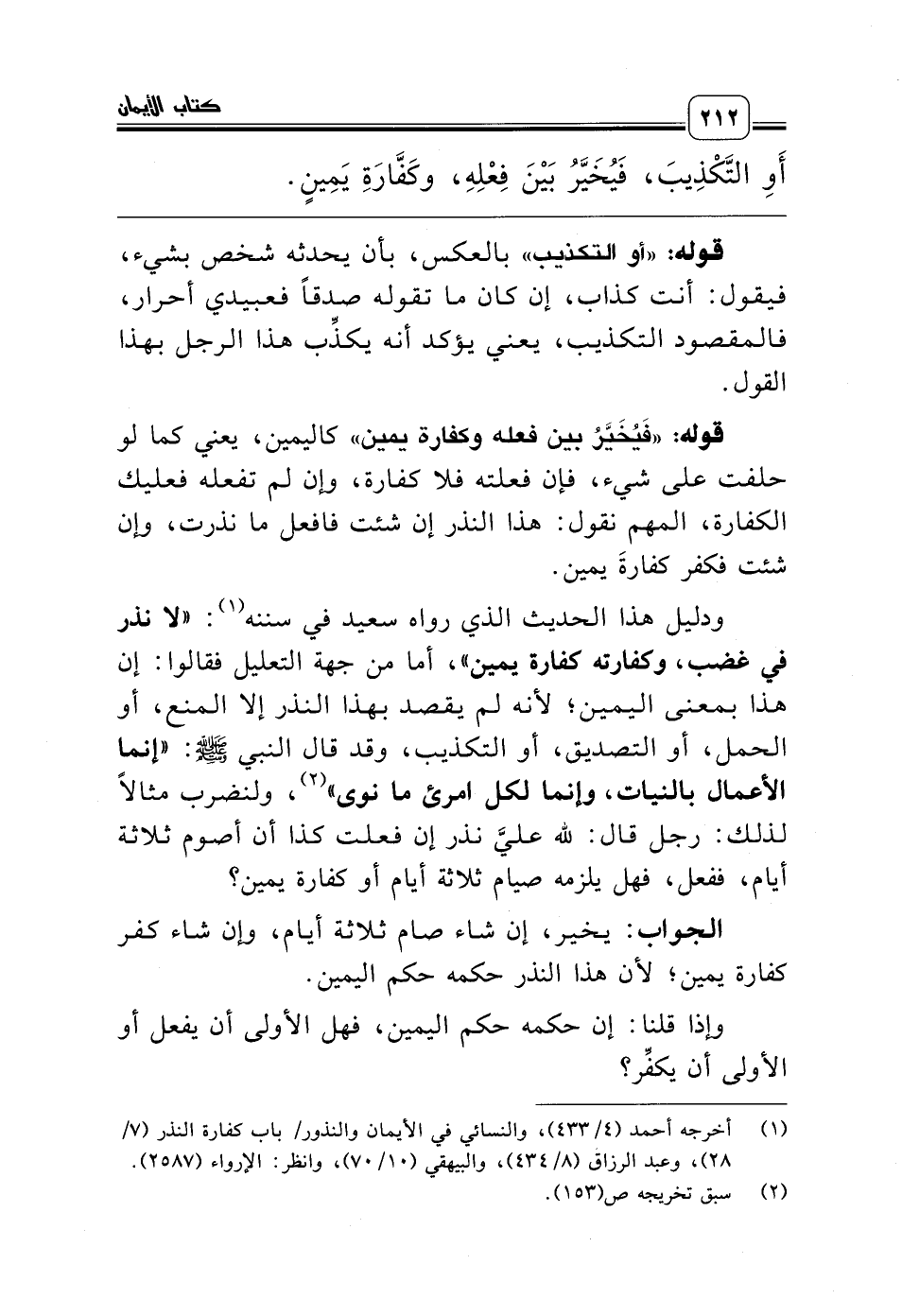 ودليل هذا الحديث الذي رواه سعيد في سننه (¬1): «لا نذر في غضب، وكفارته كفارة يمين»، أما من جهة التعليل فقالوا: إن هذا بمعنى اليمين؛ لأنه لم يقصد بهذا النذر إلا المنع، أو الحمل، أو التصديق، أو التكذيب، وقد قال النبي صلّى الله عليه وسلّم: «إنما الأعمال بالنيات، وإنما لكل امرئ ما نوى» (¬2)، ولنضرب مثالاً لذلك: رجل قال: لله عليَّ نذر إن فعلت كذا أن أصوم ثلاثة أيام، ففعل، فهل يلزمه صيام ثلاثة أيام أو كفارة يمين؟
