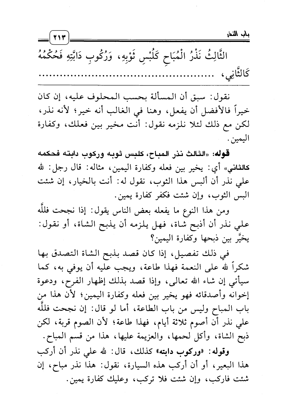 قوله: «الثالث نذر المباح، كلبس ثوبه وركوب دابته فحكمه كالثاني» أي: يخير بين فعله وكفارة اليمين، مثاله: قال رجل: لله علي نذر أن ألبس هذا الثوب، نقول له: أنت بالخيار، إن شئت البس الثوب، وإن شئت فكفر كفارة يمين.