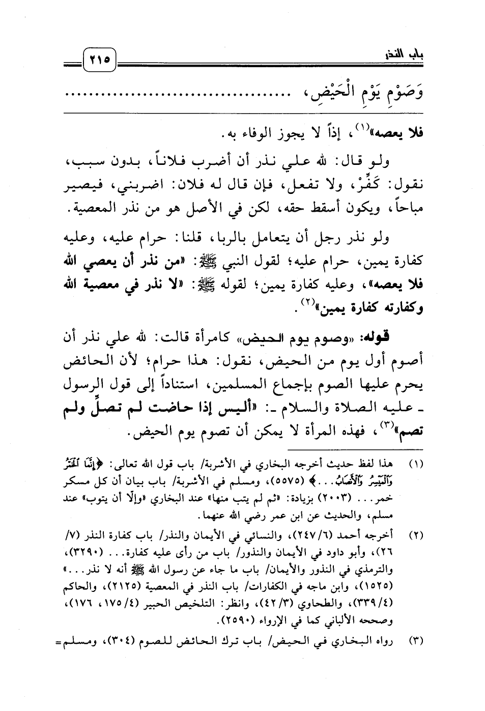 قوله: «وصوم يوم الحيض» كامرأة قالت: لله علي نذر أن أصوم أول يوم من الحيض، نقول: هذا حرام؛ لأن الحائض يحرم عليها الصوم بإجماع المسلمين، استناداً إلى قول الرسول ـ عليه الصلاة والسلام ـ: «أليس إذا حاضت لم تصلِّ ولم تصم» (¬3)، فهذه المرأة لا يمكن أن تصوم يوم الحيض.