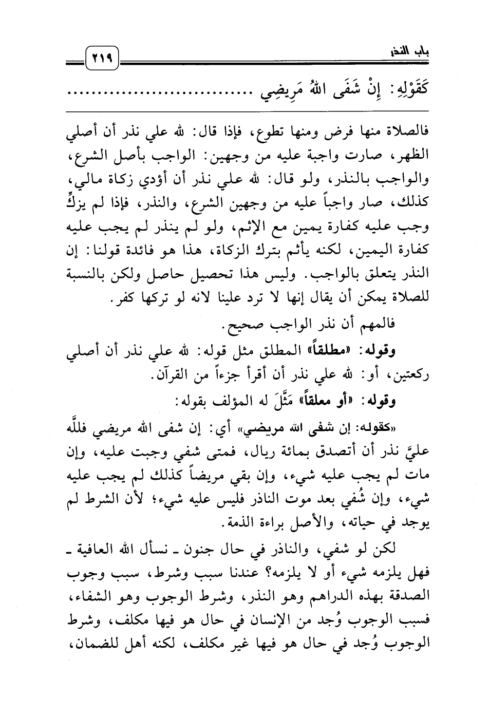 «كقوله: إن شفى الله مريضي» أي: إن شفى الله مريضي فللَّه عليَّ نذر أن أتصدق بمائة ريال، فمتى شفي وجبت عليه، وإن مات لم يجب عليه شيء، وإن بقي مريضاً كذلك لم يجب عليه شيء، وإن شُفي بعد موت الناذر فليس عليه شيء؛ لأن الشرط لم يوجد في حياته، والأصل براءة الذمة.