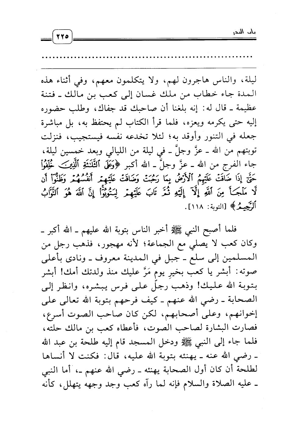 ليلة، والناس هاجرون لهم، ولا يتكلمون معهم، وفي أثناء هذه المدة جاء خطاب من ملك غسان إلى كعب بن مالك ـ فتنة عظيمة ـ قال له: إنه بلغنا أن صاحبك قد جفاك، وطلب حضوره إليه حتى يكرمه ويعزه، فلما قرأ الكتاب لم يحتفظ به، بل مباشرة جعله في التنور وأوقد به؛ لئلا تخدعه نفسه فيستجيب، فنزلت توبتهم من الله ـ عزّ وجل ـ في ليلة من الليالي وبعد خمسين ليلة، جاء الفرج من الله ـ عزّ وجل ـ الله أكبر {وَعَلَى الثَّلاَثَةِ الَّذِينَ خُلِّفُوا حَتَّى إِذَا ضَاقَتْ عَلَيْهِمُ الأَرْضُ بِمَا رَحُبَتْ وَضَاقَتْ عَلَيْهِمْ أَنْفُسُهُمْ وَظَنُّوا أَنْ لاَ مَلْجَأَ مِنَ اللَّهِ إِلاَّ إِلَيْهِ ثُمَّ تَابَ عَلَيْهِمْ لِيَتُوبُوا إِنَّ اللَّهَ هُوَ التَّوَّابُ الرَّحِيمُ *} [التوبة: 118].