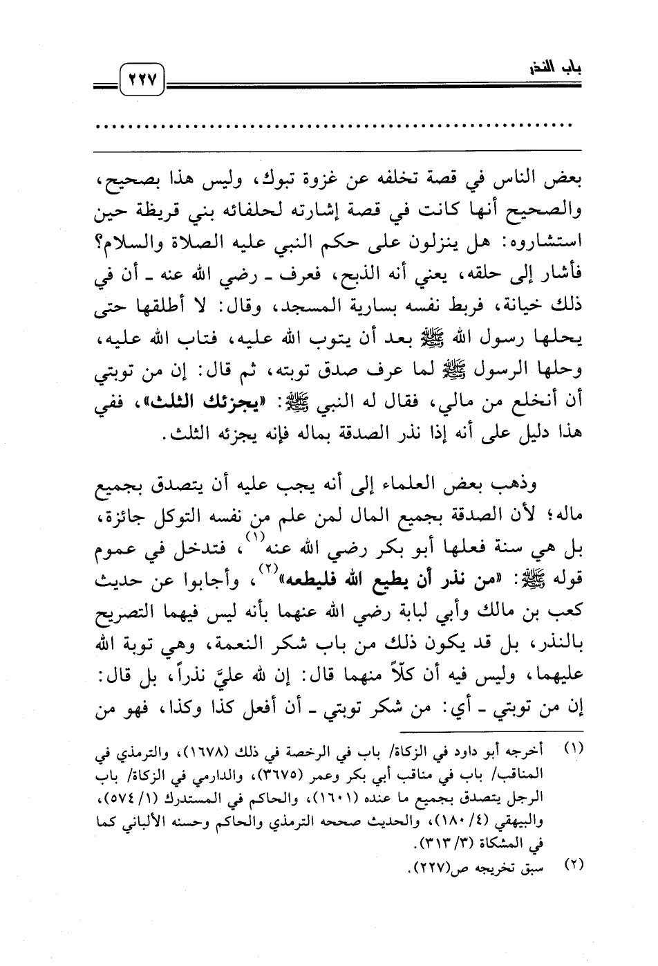 وذهب بعض العلماء إلى أنه يجب عليه أن يتصدق بجميع ماله؛ لأن الصدقة بجميع المال لمن علم من نفسه التوكل جائزة، بل هي سنة فعلها أبو بكر رضي الله عنه (¬1)، فتدخل في عموم قوله صلّى الله عليه وسلّم: «من نذر أن يطيع الله فليطعه» (¬2)، وأجابوا عن حديث كعب بن مالك وأبي لبابة رضي الله عنهما بأنه ليس فيهما التصريح بالنذر، بل قد يكون ذلك من باب شكر النعمة، وهي توبة الله عليهما، وليس فيه أن كلاًّ منهما قال: إن لله عليَّ نذراً، بل قال: إن من توبتي ـ أي: من شكر توبتي ـ أن أفعل كذا وكذا، فهو من
