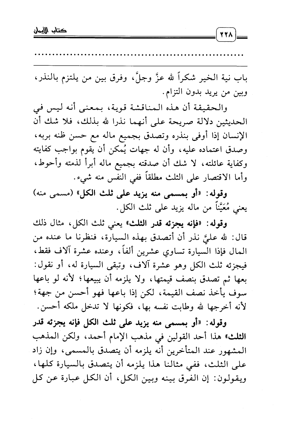 وقوله: «أو بمسمى منه يزيد على ثلث الكل فإنه يجزئه قدر الثلث» هذا أحد القولين في مذهب الإمام أحمد، ولكن المذهب المشهور عند المتأخرين أنه يلزمه أن يتصدق بالمسمى، وإن زاد على الثلث، ففي مثالنا هذا يلزمه أن يتصدق بالسيارة كلها، ويقولون: إن الفرق بينه وبين الكل، أن الكل عبارة عن كل