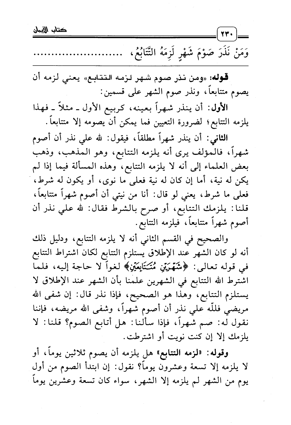 والصحيح في القسم الثاني أنه لا يلزمه التتابع، ودليل ذلك أنه لو كان الشهر عند الإطلاق يستلزم التتابع لكان اشتراط التتابع في قوله تعالى: {شَهْرَيْنِ مُتَتَابِعَيْنِ} لغواً لا حاجة إليه، فلما اشترط الله التتابع في الشهرين علمنا بأن الشهر عند الإطلاق لا يستلزم التتابع، وهذا هو الصحيح، فإذا نذر قال: إن شفى الله مريضي فلله علي نذر أن أصوم شهراً، وشفى الله مريضه، فإننا نقول له: صم شهراً، فإذا سألنا: هل أتابع الصوم؟ قلنا: لا يلزمك إلا إن كنت نويت أو اشترطت.