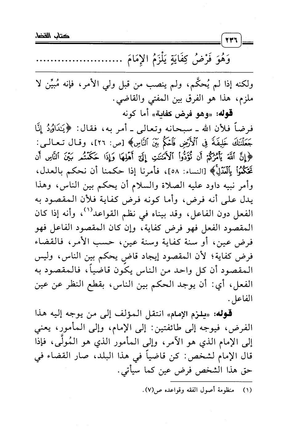 فرضاً فلأن الله ـ سبحانه وتعالى ـ أمر به، فقال: {يَادَاوُودُ إِنَّا جَعَلْنَاكَ خَلِيفَةً فِي الأَرْضِ فَاحْكُمْ بَيْنَ النَّاسِ} [ص: 26]، وقال تعالى: {إِنَّ اللَّهَ يَأْمُرُكُمْ أَنْ تُؤَدُّوا الأَمَانَاتِ إِلَى أَهْلِهَا وَإِذَا حَكَمْتُمْ بَيْنَ النَّاسِ أَنْ تَحْكُمُوا بِالْعَدْلِ} [النساء: 58]، فأمرنا إذا حكمنا أن نحكم بالعدل، وأمر نبيه داود عليه الصلاة والسلام أن يحكم بين الناس، وهذا يدل على أنه فرض، وأما كونه فرض كفاية فلأن المقصود به الفعل دون الفاعل، وقد بيناه في نظم القواعد (¬1)، وأنه إذا كان المقصود الفعل فهو فرض كفاية، وإن كان المقصود الفاعل فهو فرض عين، أو سنة كفاية وسنة عين، حسب الأمر، فالقضاء فرض كفاية؛ لأن المقصود إيجاد قاضٍ يحكم بين الناس، وليس المقصود أن كل واحد من الناس يكون قاضياً، فالمقصود به الفعل، أي: أن يوجد الحكم بين الناس، بقطع النظر عن عين الفاعل.