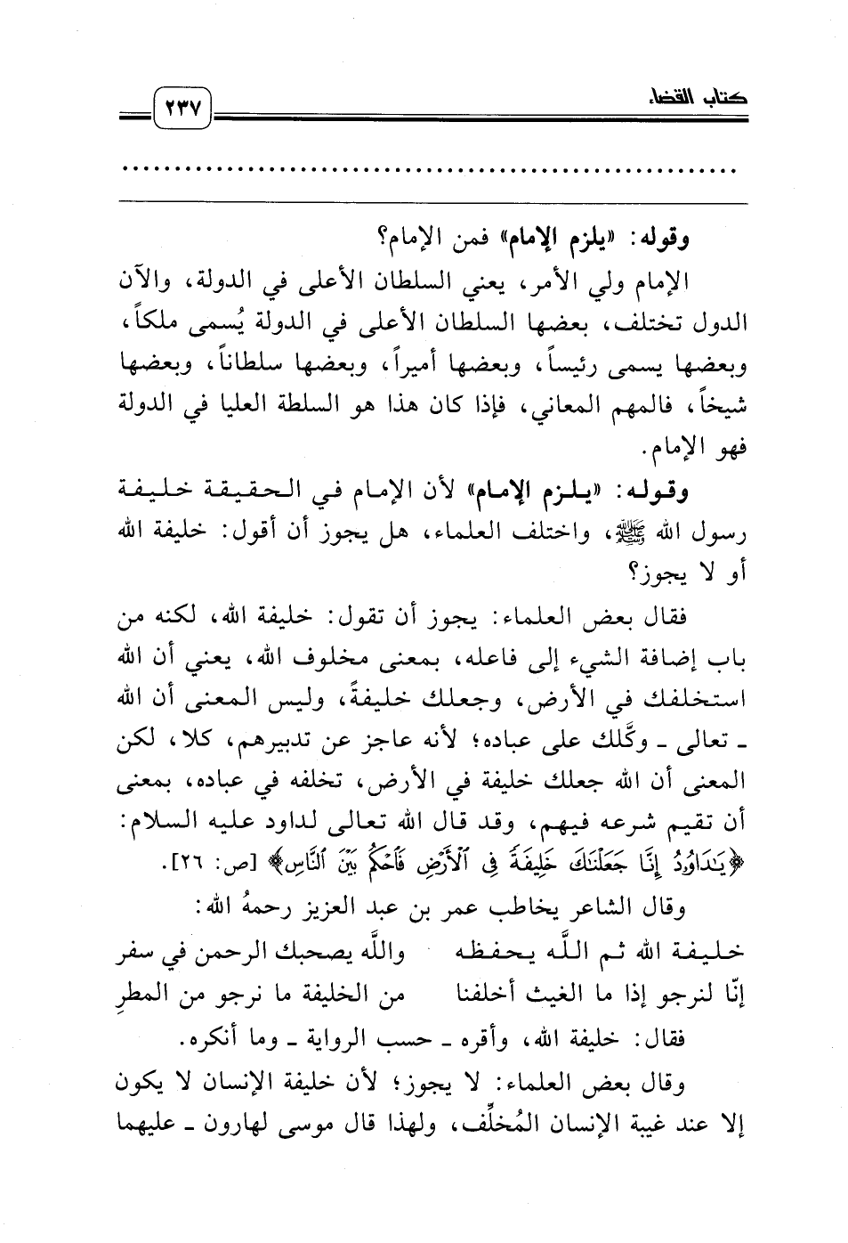 وقوله: «يلزم الإمام» لأن الإمام في الحقيقة خليفة رسول الله صلّى الله عليه وسلّم، واختلف العلماء، هل يجوز أن أقول: خليفة الله أو لا يجوز؟