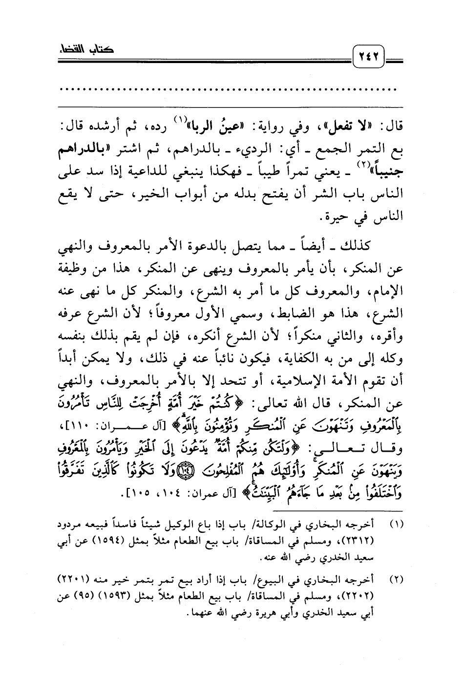 (¬1) أخرجه البخاري في الوكالة/ باب إذا باع الوكيل شيئاً فاسداً فبيعه مردود (2312)، ومسلم في المساقاة/ باب بيع الطعام مثلاً بمثل (1594) عن أبي سعيد الخدري رضي الله عنه.
