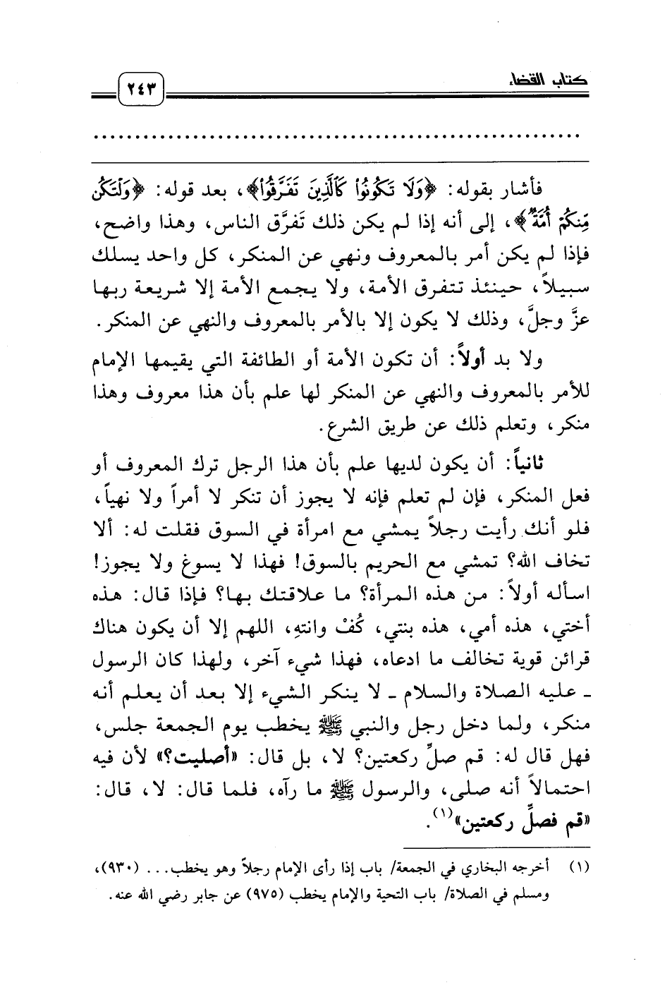 فأشار بقوله: {وَلاَ تَكُونُوا كَالَّذِينَ تَفَرَّقُوا}، بعد قوله: {وَلْتَكُنْ مِنْكُمْ أُمَةٌ}، إلى أنه إذا لم يكن ذلك تَفرَّق الناس، وهذا واضح، فإذا لم يكن أمر بالمعروف ونهي عن المنكر، كل واحد يسلك سبيلاً، حينئذ تتفرق الأمة، ولا يجمع الأمة إلا شريعة ربها عزّ وجل، وذلك لا يكون إلا بالأمر بالمعروف والنهي عن المنكر.