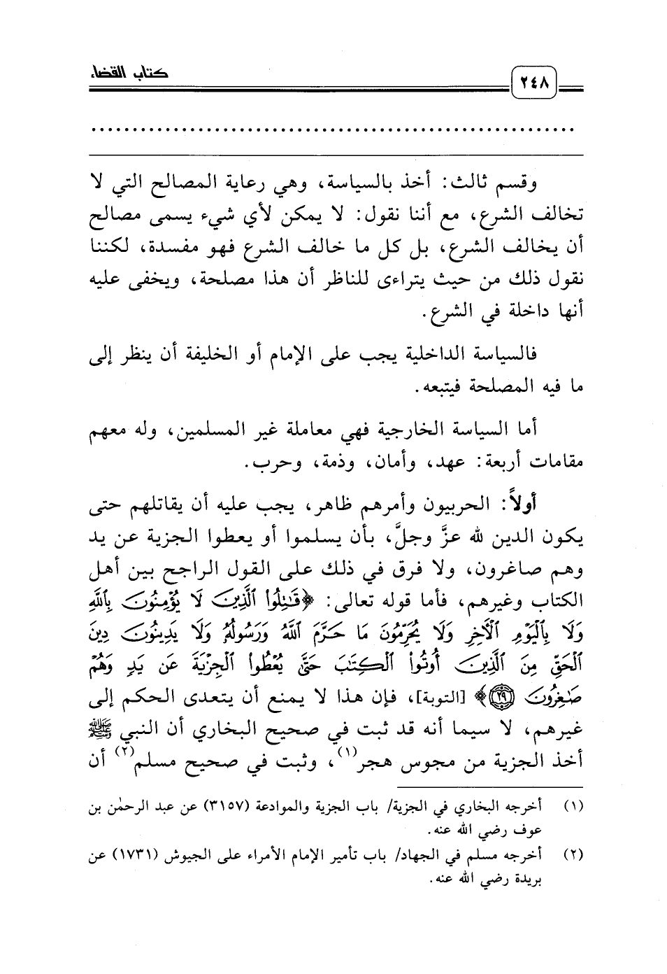 أما السياسة الخارجية فهي معاملة غير المسلمين، وله معهم مقامات أربعة: عهد، وأمان، وذمة، وحرب.