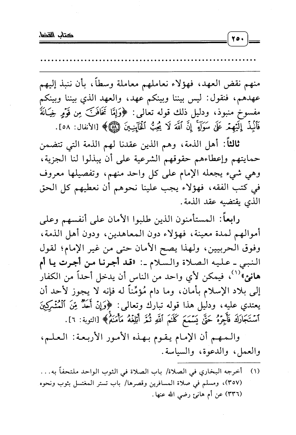 رابعاً: المستأمنون الذين طلبوا الأمان على أنفسهم وعلى أموالهم لمدة معينة، فهؤلاء دون المعاهدين، ودون أهل الذمة، وفوق الحربيين، ولهذا يصح الأمان حتى من غير الإمام؛ لقول النبي ـ عليه الصلاة والسلام ـ: «قد أجرنا من أجرت يا أم هانئ» (¬1)، فيمكن لأي واحد من الناس أن يدخل أحداً من الكفار إلى بلاد الإسلام بأمان، وما دام مُؤمِّناً له فإنه لا يجوز لأحد أن يعتدي عليه، ودليل هذا قوله تبارك وتعالى: {وَإِنْ أَحَدٌ مِنَ الْمُشْرِكِينَ اسْتَجَارَكَ فَأَجِرْهُ حَتَّى يَسْمَعَ كَلاَمَ اللَّهِ ثُمَّ أَبْلِغْهُ مَأْمَنَهُ} [التوبة: 6].