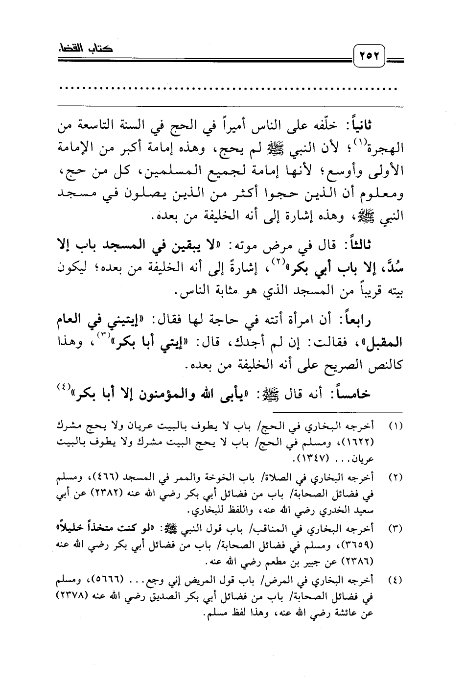 رابعاً: أن امرأة أتته في حاجة لها فقال: «إيتيني في العام المقبل»، فقالت: إن لم أجدك، قال: «إيتي أبا بكر» (¬3)، وهذا كالنص الصريح على أنه الخليفة من بعده.