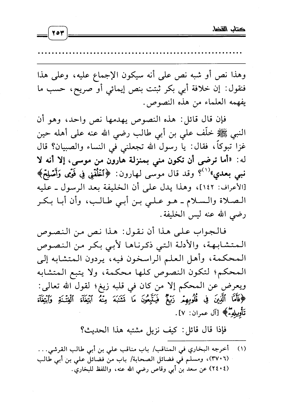 فإن قال قائل: هذه النصوص يهدمها نص واحد، وهو أن النبي صلّى الله عليه وسلّم خلّف علي بن أبي طالب رضي الله عنه على أهله حين غزا تبوكاً، فقال: يا رسول الله تجعلني في النساء والصبيان؟ قال له: «أما ترضى أن تكون مني بمنزلة هارون من موسى، إلا أنه لا نبي بعدي» (¬1)؟ وقد قال موسى لهارون: {اخْلُفْنِي فِي قَوْمِي وَأَصْلِحْ} [الأعراف: 142]، وهذا يدل على أن الخليفة بعد الرسول ـ عليه الصلاة والسلام ـ هو علي بن أبي طالب، وأن أبا بكر رضي الله عنه ليس الخليفة.