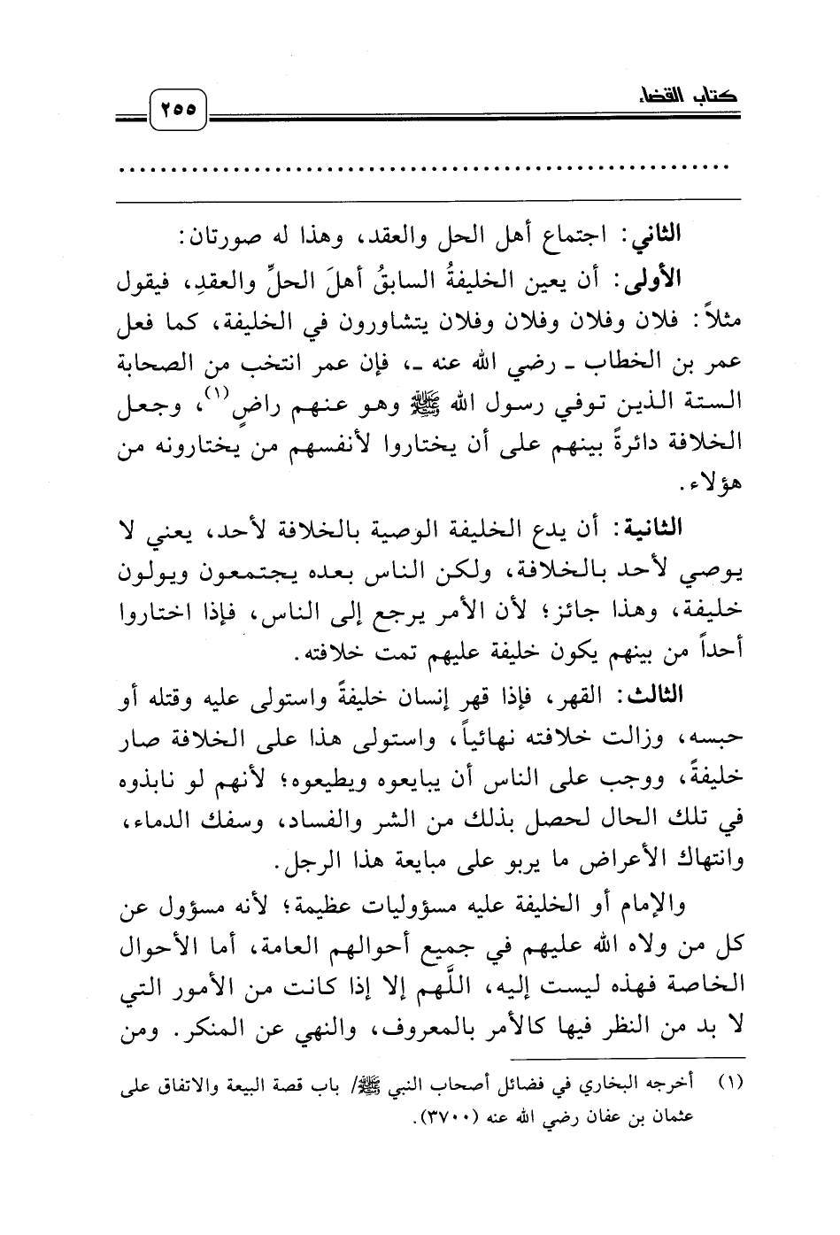 الأولى: أن يعين الخليفةُ السابقُ أهلَ الحلِّ والعقدِ، فيقول مثلاً: فلان وفلان وفلان وفلان يتشاورون في الخليفة، كما فعل عمر بن الخطاب ـ رضي الله عنه ـ، فإن عمر انتخب من الصحابة الستة الذين توفي رسول الله صلّى الله عليه وسلّم وهو عنهم راضٍ (¬1)، وجعل الخلافة دائرةً بينهم على أن يختاروا لأنفسهم من يختارونه من هؤلاء.