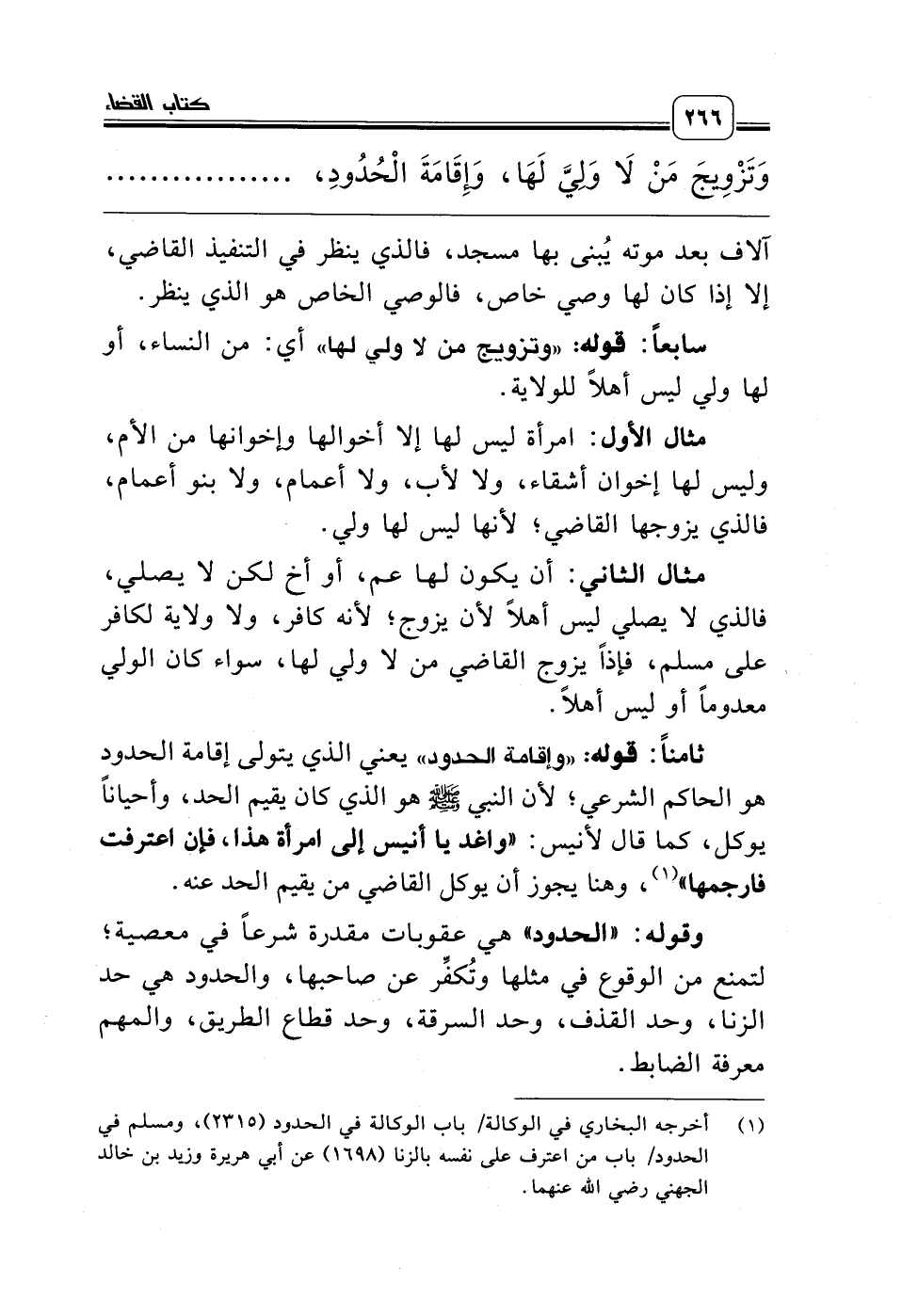 ثامناً: قوله: «وإقامة الحدود» يعني الذي يتولى إقامة الحدود هو الحاكم الشرعي؛ لأن النبي صلّى الله عليه وسلّم هو الذي كان يقيم الحد، وأحياناً يوكل، كما قال لأنيس: «واغد يا أنيس إلى امرأة هذا، فإن اعترفت فارجمها» (¬1)، وهنا يجوز أن يوكل القاضي من يقيم الحد عنه.