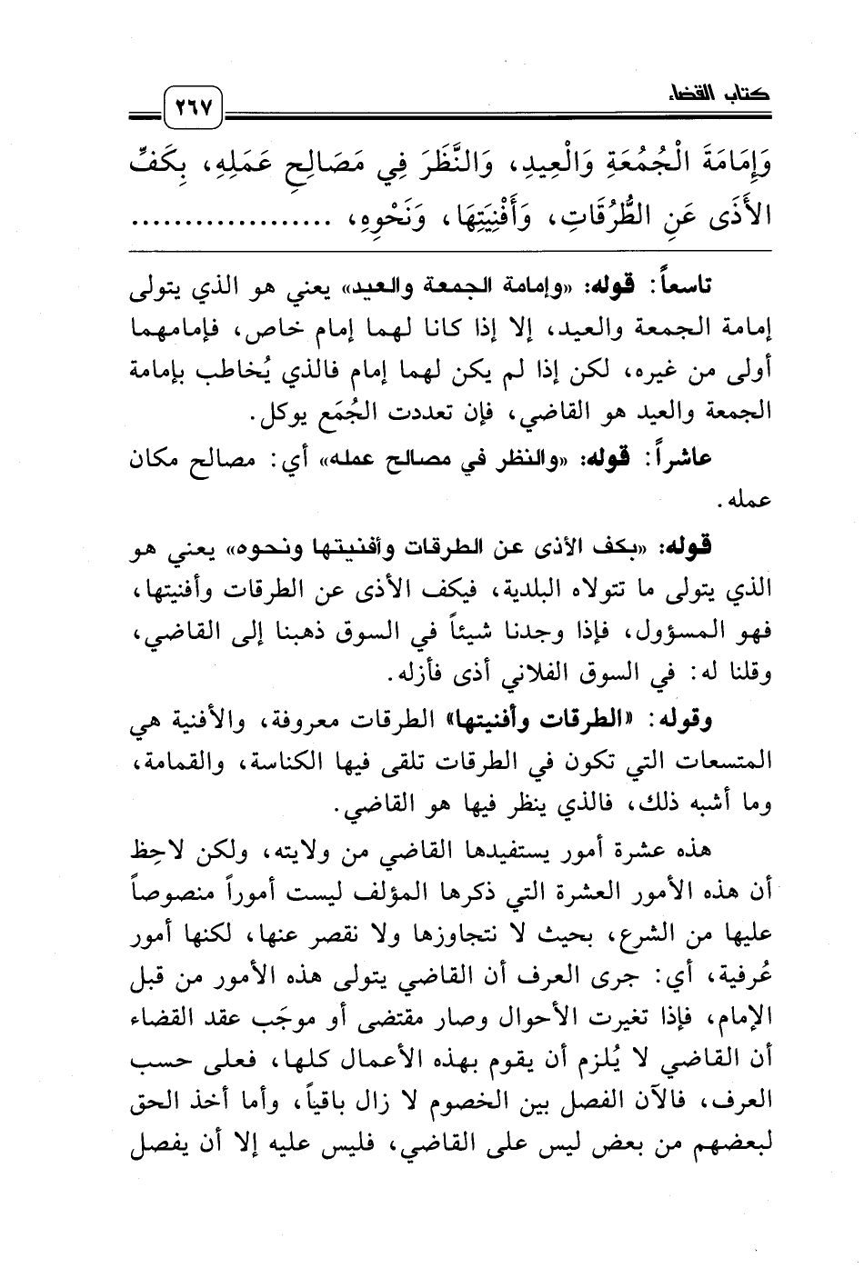 تاسعاً: قوله: «وإمامة الجمعة والعيد» يعني هو الذي يتولى إمامة الجمعة والعيد، إلا إذا كانا لهما إمام خاص، فإمامهما أولى من غيره، لكن إذا لم يكن لهما إمام فالذي يُخاطب بإمامة الجمعة والعيد هو القاضي، فإن تعددت الجُمَع يوكل.