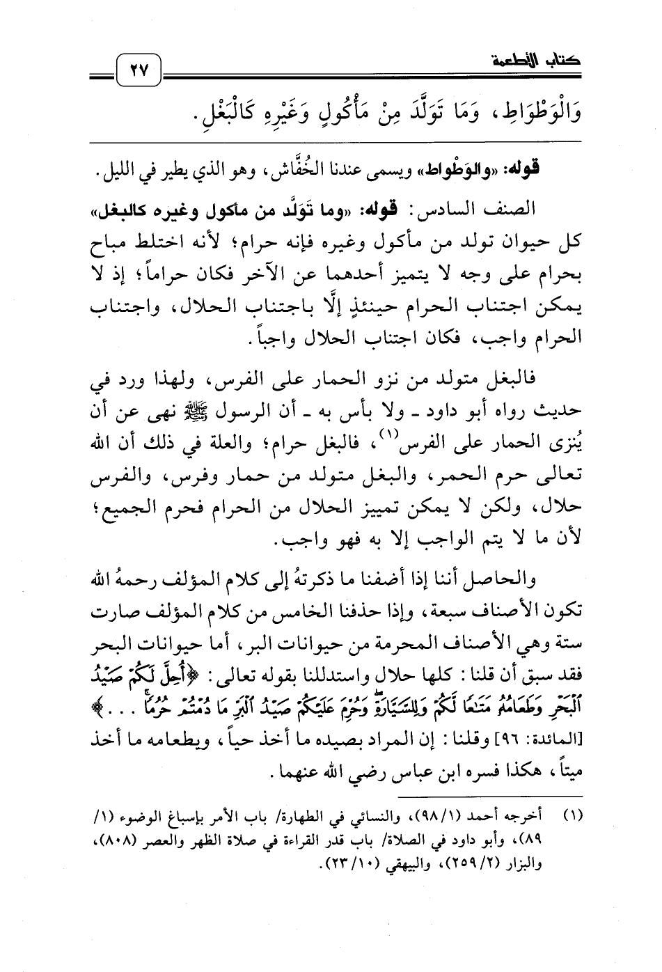 الصنف السادس: قوله: «وما تَوَلَّد من مأكول وغيره كالبغل» كل حيوان تولد من مأكول وغيره فإنه حرام؛ لأنه اختلط مباح بحرام على وجه لا يتميز أحدهما عن الآخر فكان حراماً؛ إذ لا يمكن اجتناب الحرام حينئذٍ إلاَّ باجتناب الحلال، واجتناب الحرام واجب، فكان اجتناب الحلال واجباً.