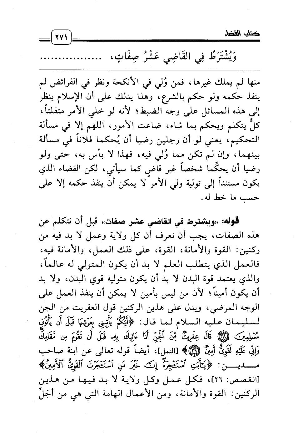 قوله: «ويشترط في القاضي عشر صفات» قبل أن نتكلم عن هذه الصفات، يجب أن نعرف أن كل ولاية وعمل لا بد فيه من ركنين: القوة والأمانة، القوة، على ذلك العمل، والأمانة فيه، فالعمل الذي يتطلب العلم لا بد أن يكون المتولي له عالماً، والذي يعتمد قوة البدن لا بد أن يكون متوليه قوي البدن، ولا بد أن يكون أميناً؛ لأن من ليس بأمين لا يمكن أن ينفذ العمل على الوجه المرضي، ويدل على هذين الركنين قول العفريت من الجن لسليمان عليه السلام لما قال: {أَيُّكُمْ يَأْتِينِي بِعَرْشِهَا قَبْلَ أَنْ يَأْتُونِي مُسْلِمِينَ} {قَالَ عِفْرِيتٌ مِنَ الْجِنِّ أَنَا آتِيكَ بِهِ قَبْلَ أَنْ تَقُومَ مِنْ مَقَامِكَ وَإِنِّي عَلَيْهِ لَقَوِيٌّ أَمِينٌ *} [النمل]، أيضاً قوله تعالى عن ابنة صاحب مدين: {يَاأَبَتِ اسْتَأْجِرْهُ إِنَّ خَيْرَ مَنِ اسْتَأْجَرْتَ الْقَوِيُّ الأَمِينُ} [القصص: 26]، فكل عمل وكل ولاية لا بد فيها من هذين الركنين: القوة والأمانة، ومن الأعمال الهامة التي هي من أجَلِّ