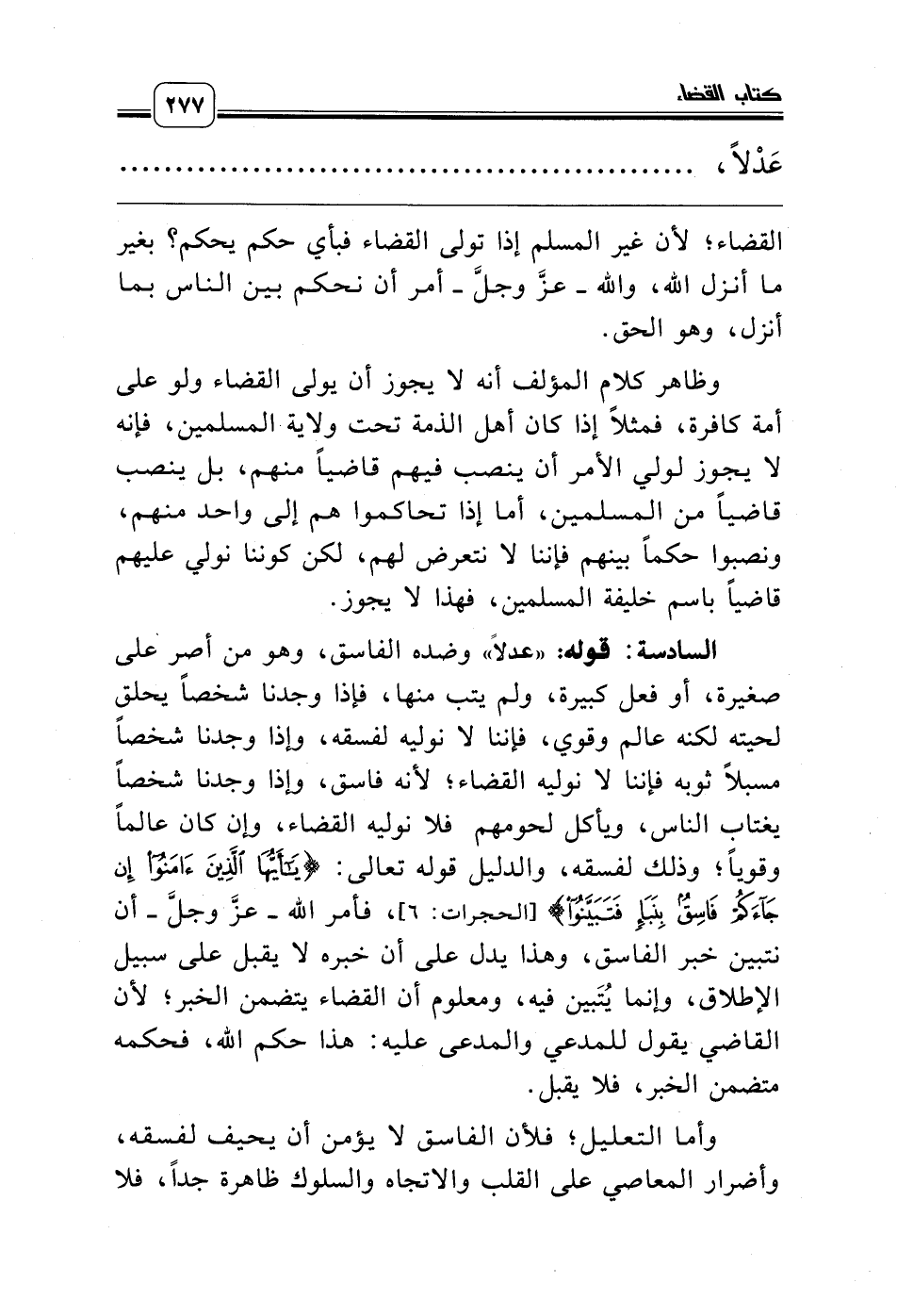السادسة: قوله: «عدلاً» وضده الفاسق، وهو من أصر على صغيرة، أو فعل كبيرة، ولم يتب منها، فإذا وجدنا شخصاً يحلق لحيته لكنه عالم وقوي، فإننا لا نوليه لفسقه، وإذا وجدنا شخصاً مسبلاً ثوبه فإننا لا نوليه القضاء؛ لأنه فاسق، وإذا وجدنا شخصاً يغتاب الناس، ويأكل لحومهم فلا نوليه القضاء، وإن كان عالماً وقوياً؛ وذلك لفسقه، والدليل قوله تعالى: {يَاأَيُّهَا الَّذِينَ آمَنُوا إِنْ جَاءَكُمْ فَاسِقٌ بِنَبَإٍ فَتَبَيَّنُوا} [الحجرات: 6]، فأمر الله ـ عزّ وجل ـ أن نتبين خبر الفاسق، وهذا يدل على أن خبره لا يقبل على سبيل الإطلاق، وإنما يُتَبين فيه، ومعلوم أن القضاء يتضمن الخبر؛ لأن القاضي يقول للمدعي والمدعى عليه: هذا حكم الله، فحكمه متضمن الخبر، فلا يقبل.