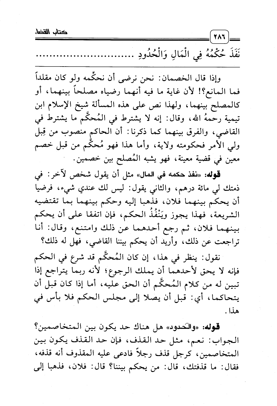 قوله: «والحدود» هل هناك حد يكون بين المتخاصمين؟ الجواب: نعم، مثل حد القذف، فإن حد القذف يكون بين المتخاصمين، كرجل قذف رجلاً فادعى عليه المقذوف أنه قذفه، فقال: ما قذفتك، قال: من يحكم بيننا؟ قال: فلان، فذهبا إلى
