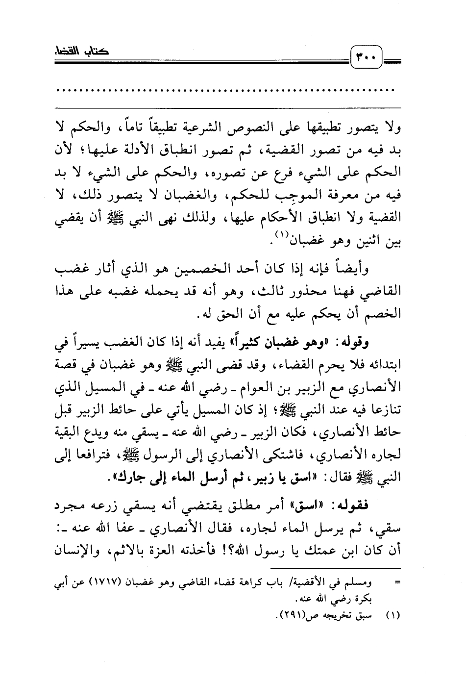 وقوله: «وهو غضبان كثيراً» يفيد أنه إذا كان الغضب يسيراً في ابتدائه فلا يحرم القضاء، وقد قضى النبي صلّى الله عليه وسلّم وهو غضبان في قصة الأنصاري مع الزبير بن العوام ـ رضي الله عنه ـ في المسيل الذي تنازعا فيه عند النبي صلّى الله عليه وسلّم؛ إذ كان المسيل يأتي على حائط الزبير قبل حائط الأنصاري، فكان الزبير ـ رضي الله عنه ـ يسقي منه ويدع البقية لجاره الأنصاري، فاشتكى الأنصاري إلى الرسول صلّى الله عليه وسلّم، فترافعا إلى النبي صلّى الله عليه وسلّم فقال: «اسق يا زبير، ثم أرسل الماء إلى جارك».