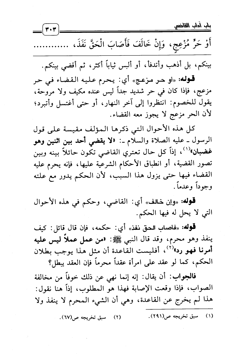 قوله: «أو حر مزعج» أي: يحرم عليه القضاء في حر مزعج، فإذا كان في حر شديد جداً ليس عنده مكيف ولا مروحة، يقول للخصوم: انتظروا إلى آخر النهار، أو حتى أغتسل وأتبرد؛ لأن الحر مزعج لا يجوز معه القضاء.