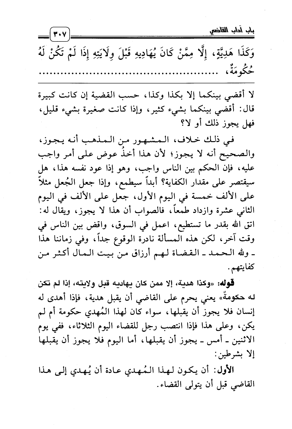 قوله: «وكذا هدية، إلا ممن كان يهاديه قبل ولايته، إذا لم تكن له حكومةٌ» يعني يحرم على القاضي أن يقبل هدية، فإذا أهدى له إنسان فلا يجوز أن يقبلها، سواء كان لهذا المُهدي حكومة أم لم يكن، وعلى هذا فإذا انتصب رجل للقضاء اليوم الثلاثاء، ففي يوم الاثنين ـ أمس ـ يجوز أن يقبلها، أما اليوم فلا يجوز أن يقبلها إلا بشرطين: