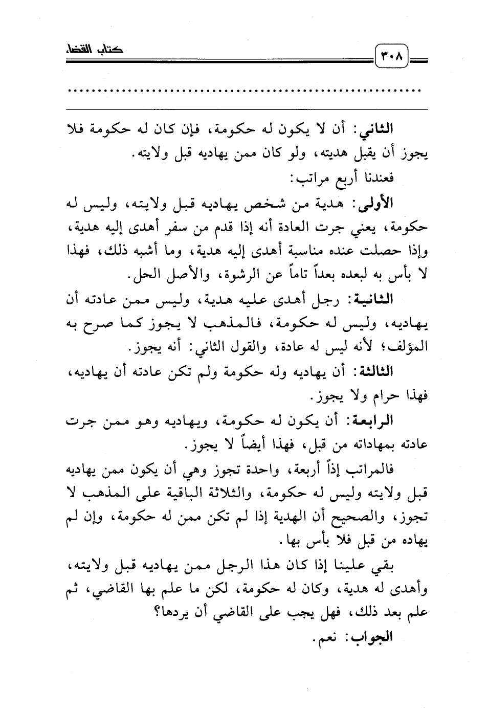 فالمراتب إذاً أربعة، واحدة تجوز وهي أن يكون ممن يهاديه قبل ولايته وليس له حكومة، والثلاثة الباقية على المذهب لا تجوز، والصحيح أن الهدية إذا لم تكن ممن له حكومة، وإن لم يهاده من قبل فلا بأس بها.