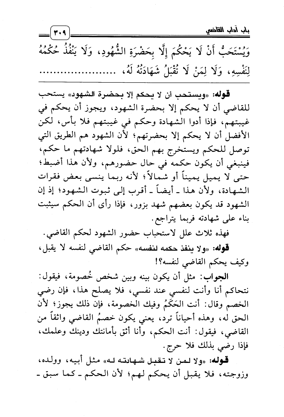 قوله: «ويستحب أن لا يحكم إلا بحضرة الشهود» يستحب للقاضي أن لا يحكم إلا بحضرة الشهود، ويجوز أن يحكم في غيبتهم، فإذا أدوا الشهادة وحكم في غيبتهم فلا بأس، لكن الأفضل أن لا يحكم إلا بحضرتهم؛ لأن الشهود هم الطريق التي توصل للحكم ويستخرج بهم الحق، فلولا شهادتهم ما حكم، فينبغي أن يكون حكمه في حال حضورهم، ولأن هذا أضبط؛ حتى لا يميل يميناً أو شمالاً؛ لأنه ربما ينسى بعض فقرات الشهادة، ولأن هذا ـ أيضاً ـ أقرب إلى ثبوت الشهود؛ إذ إن الشهود قد يكون بعضهم شهد بزور، فإذا رأى أن الحكم سيثبت بناء على شهادته فربما يتراجع.