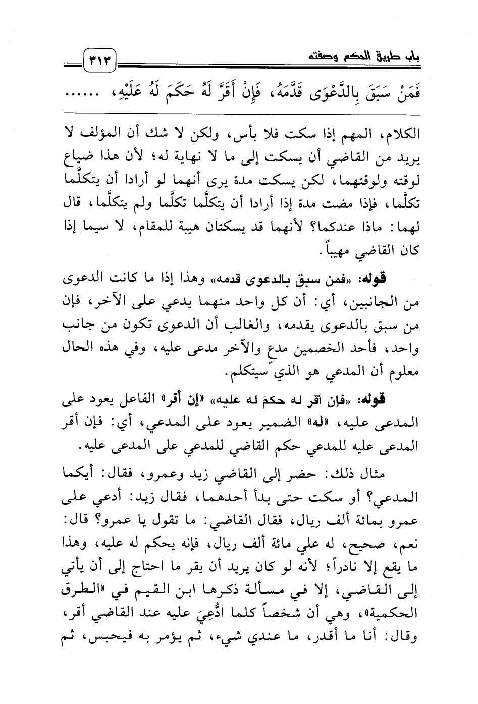 مثال ذلك: حضر إلى القاضي زيد وعمرو، فقال: أيكما المدعي؟ أو سكت حتى بدأ أحدهما، فقال زيد: أدعي على عمرو بمائة ألف ريال، فقال القاضي: ما تقول يا عمرو؟ قال: نعم، صحيح، له علي مائة ألف ريال، فإنه يحكم له عليه، وهذا ما يقع إلا نادراً؛ لأنه لو كان يريد أن يقر ما احتاج إلى أن يأتي إلى القاضي، إلا في مسألة ذكرها ابن القيم في «الطرق الحكمية»، وهي أن شخصاً كلما ادُّعِيَ عليه عند القاضي أقر، وقال: أنا ما أقدر، ما عندي شيء، ثم يؤمر به فيحبس، ثم
