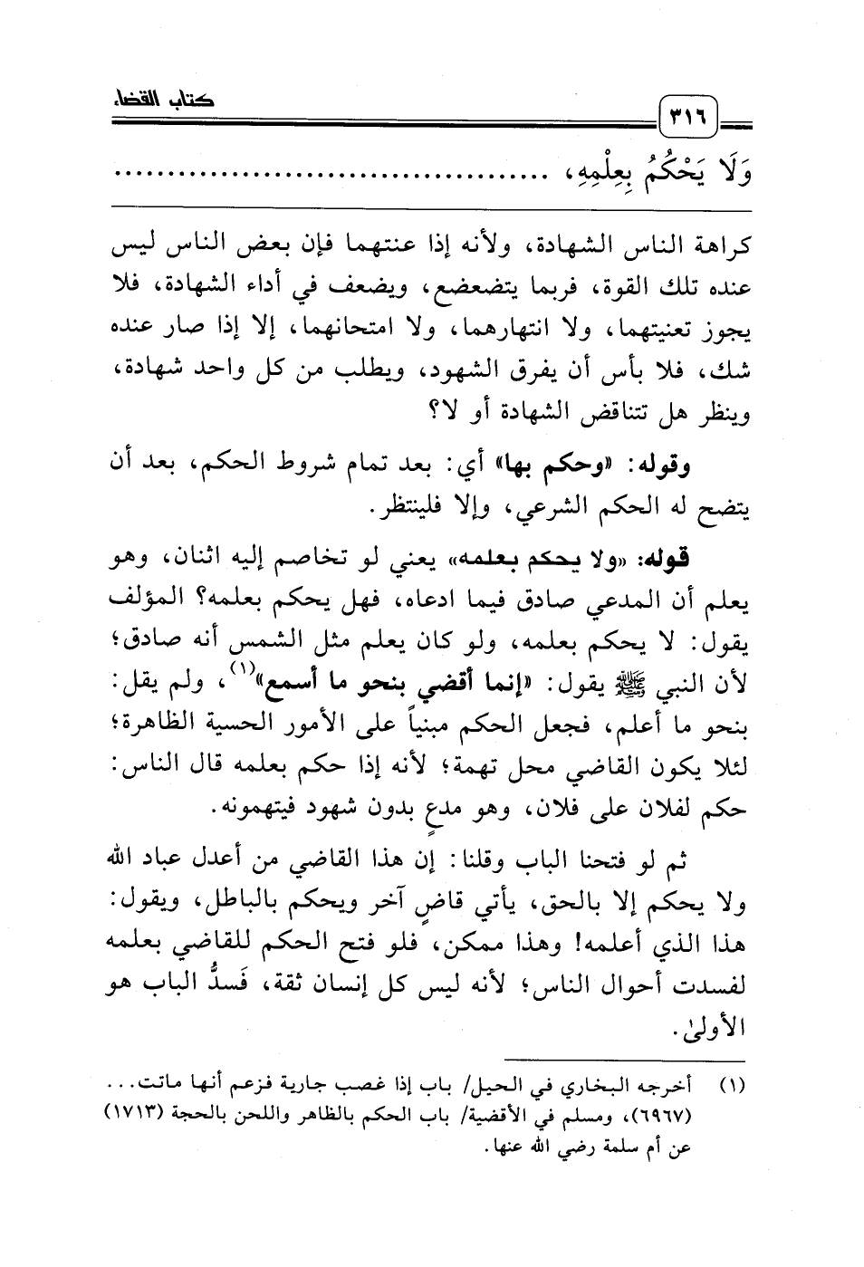 قوله: «ولا يحكم بعلمه» يعني لو تخاصم إليه اثنان، وهو يعلم أن المدعي صادق فيما ادعاه، فهل يحكم بعلمه؟ المؤلف يقول: لا يحكم بعلمه، ولو كان يعلم مثل الشمس أنه صادق؛ لأن النبي صلّى الله عليه وسلّم يقول: «إنما أقضي بنحو ما أسمع» (¬1)، ولم يقل: بنحو ما أعلم، فجعل الحكم مبنياً على الأمور الحسية الظاهرة؛ لئلا يكون القاضي محل تهمة؛ لأنه إذا حكم بعلمه قال الناس: حكم لفلان على فلان، وهو مدعٍ بدون شهود فيتهمونه.